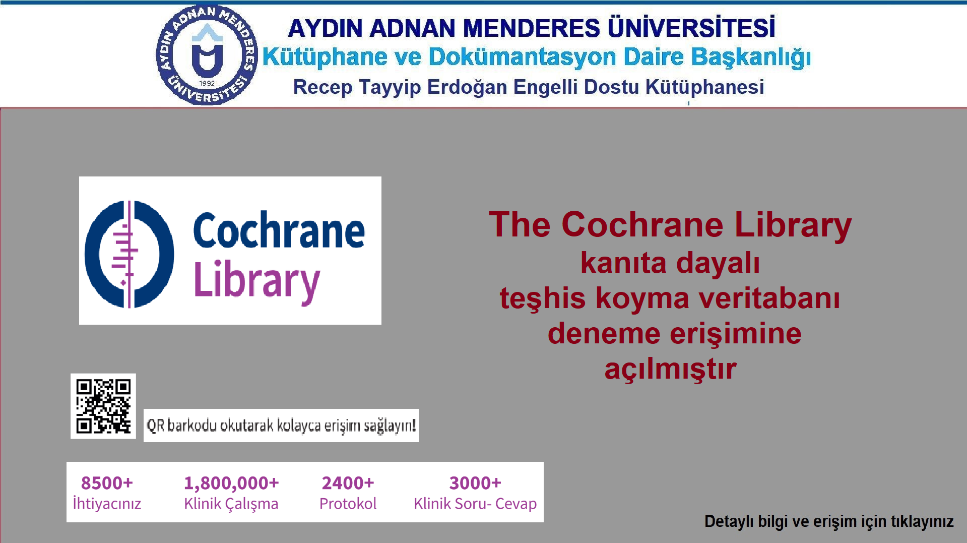 The Cochrane Library kanıta dayalı teşhis koyma veritabanı 1 aylik deneme erişimi 10 Mayis 2023 tarihinden itibaren başlamıştır. Genel hedefi, dünya çapında her gün uygulanan tedavilerin bağımsız olarak değerlendirilip kontrolleri yapılarak mümkün olan en iyi sonucu uzmanlarına sunmaktır. Sağlık alanında karar verme sürecini iyileştirmek, desteklemek için farklı türde yüksek kaliteli, bağımsız kanıtlar içeren bir veri tabanı koleksiyonudur.
