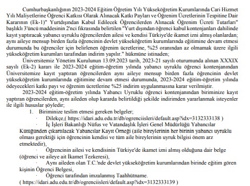 Yabancı Uyruklu Öğrenci Kontenjanından Kayıt Olanlara %25İndirim Uygulanması hk.