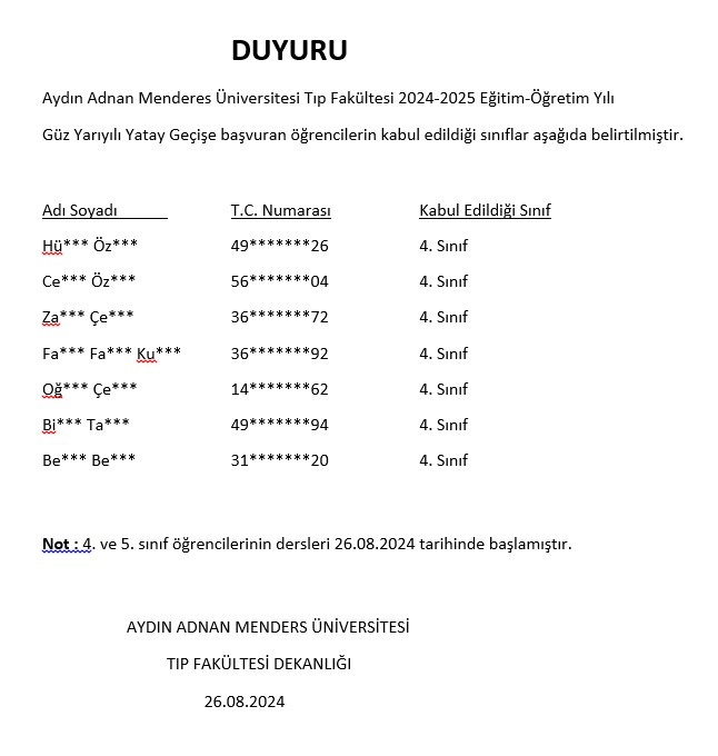 Yatay Geçiş Sınıf Tespit Duyurusu