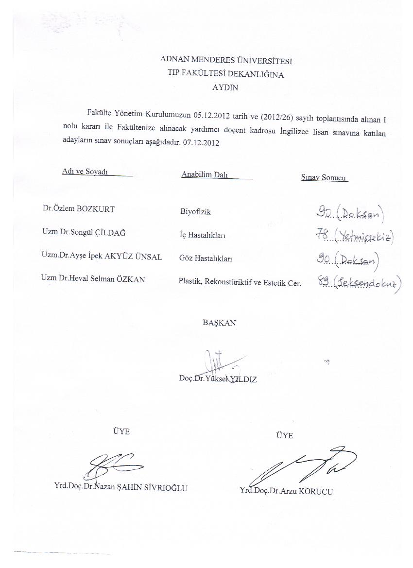 Yrd. Doç. Kadrosu İngilizce Dil Sınavı Sonucu