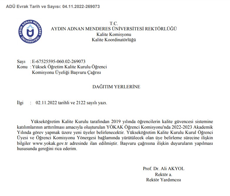 Yüksek Öğretim Kalite Kurulu Öğrenci Komisyonu Üyeliği Başvuru Çağrısı