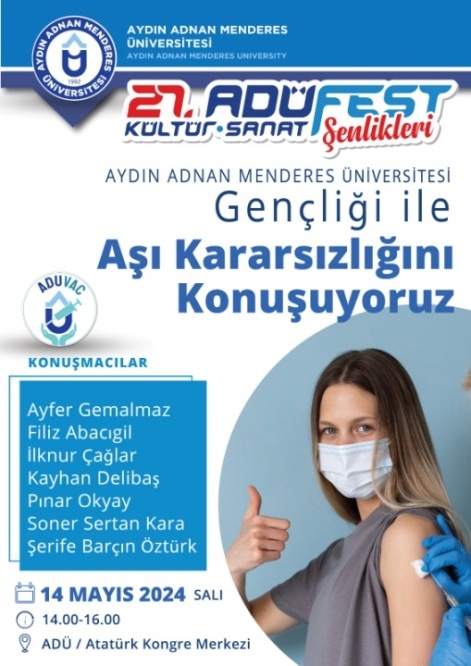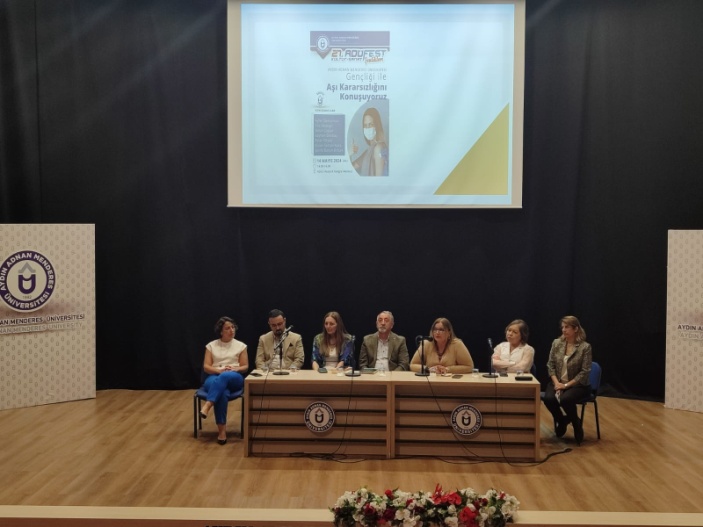 Avrupa Halk Sağlığı Haftası bu yıl 13-17 Mayıs 2024 tarihleri arasında "Sağlık Politik Bir Seçimdir" teması ile kutlanmaya başlamıştır. Bu tema kapsamında ikinci gün etkinliği olarak düzenlenen "Adnan Menderes Üniversitesi Gençliği İle Aşı Kararsızlığını Konuşuyoruz" Paneli, üniversitemiz 27. ADÜFEST Kültür-Sanat-Spor Şenlikleri programında yer almıştır. Panel 14 Mayıs 2024 Salı günü 14:00-16:00 saatleri arasında Aydın Adnan Menderes Üniversitesi Atatürk Kongre Merkezi'nde Prof. Dr. Pınar Okyay moderatörlüğünde yüz yüze gerçekleştirilmiştir. Aydın Adnan Menderes Üniversitesi Tıp Fakültesi Dekanı Prof. Dr. Ayhan Aköz ve Dekan Yardımcısı Doç. Dr. Onur Yazıcı panelde katılım göstermiştir. Panelde Aydın Adnan Menderes Üniversitesi bünyesinde görev yapan öğretim üyeleri, "aşı tarihçesi, çocukluk çağı aşıları ve ulusal aşı programı, erişkin aşılama, soğuk zincir ve birinci basamakta aşı uygulamaları, aşı kararsızlığı ve aşı iletişimi, risk toplumu ve aşı karasızlığına sosyolojik bakış" konularında sunumlar yapmıştır. Sunumlar sonrasında katılımcılarla soru-cevap bölümü yapılmıştır. Panele toplam 107 öğrenci ve öğretim üyesi katılmıştır.