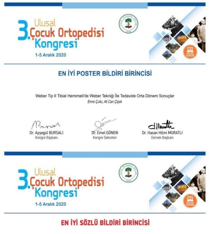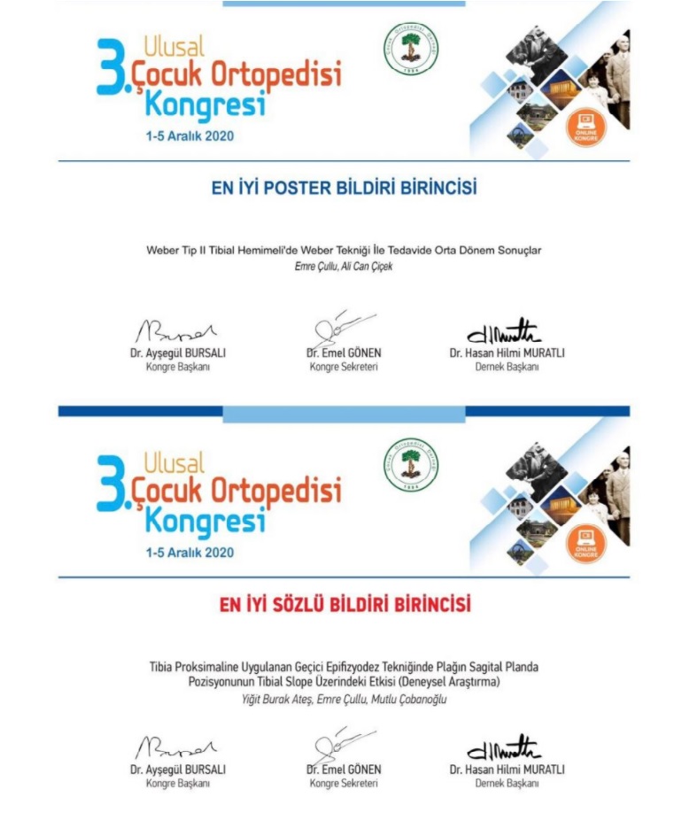Ortopedi ve Travmatoloji Anabilim Dalı ÖÄŸretim Üyemiz Prof. Dr. Emre Çullu ve çalışma arkadaÅŸları “En İyi Sözlü Bildiri“ ve “En İyi Poster“ birinciliklerini kazanmışlardır. En İyi Sözlü Bildiri dalında birincilik kazanan “TİBİA PROKSİMALİNE UYGULANAN GEÇİCİ EPİFİZYODEZ TEKNİĞİNDE PLAÄžIN SAGİTAL PLANDA POZİSYONUNUN TİBİAL SLOPE ÜZERİNDEKİ ETKİSİ (DENEYSEL ARAÅžTIRMA)” adlı çalışma Üniversitemiz BAP projesi ile desteklenmiÅŸ bir çalışmadır.