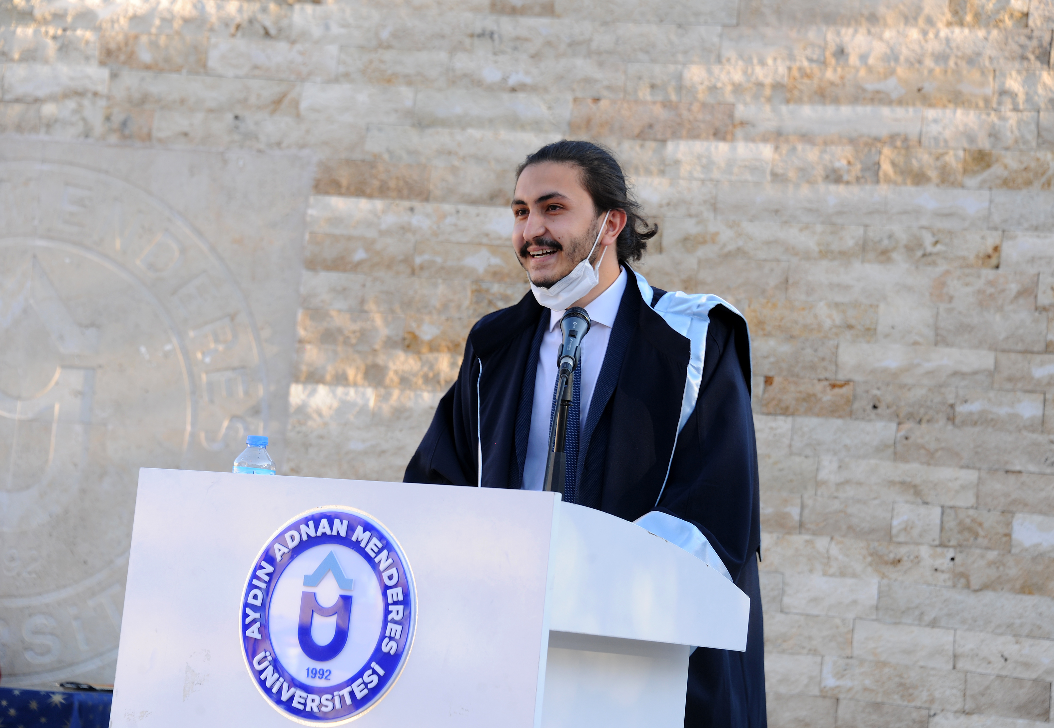 SaÄŸlık hizmeti sunmak için pandemi sürecinde hayatını kaybeden saÄŸlık çalışanlarını anarak sözlerine baÅŸlayan Dönem Birincisi Doktor Berk Mutlu, giydikleri beyaz önlüÄŸün ağırlığının farkında olduklarını belirterek “Ortak gayretimiz; vatana, millete, devlete katkı sunan iyi birer hekim olmaktır.” dedi. Dr. Mutlu konuÅŸmasının sonunda emeklerinden dolayı bölüm hocalarına ve bu süreçte kendilerine destek veren ailelerine teÅŸekkür etti.