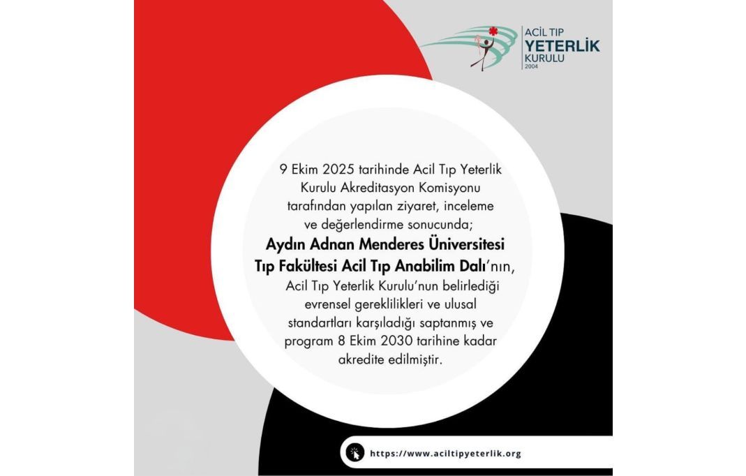 09 Ekim 2025 tarihinde Acil Tıp Yeterlilik Kurulu Akreditasyon Komisyonu tarafından yapılan ziyaret, inceleme ve deÄŸerlendirme sonucunda, Fakültemiz Acil Tıp Ana Bilim Dalı’nın, Acil Tıp Yeterlilik Kurulu'nun belirlediÄŸi evrensel gereklilikleri ve ulusal standartları karşıladığı saptanmış ve Acil Tıp Ana Bilim Dalı 8 Ekim 2030 tarihine kadar akredite olmuÅŸtur.