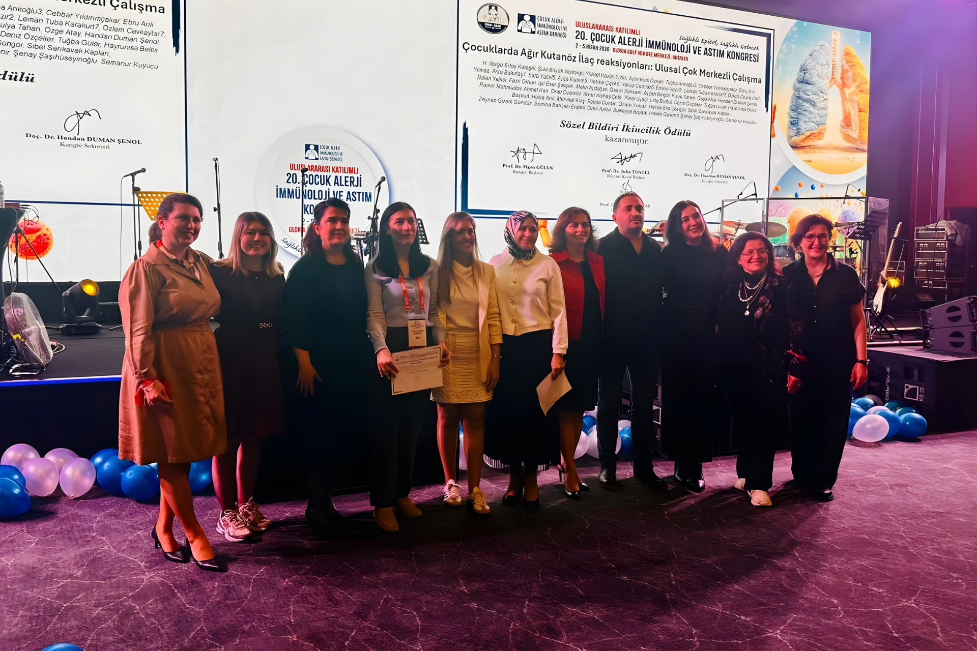Sözel bildiri ikincilik ödülü, “Çocuklarda Ağır Kutanöz İlaç Reaksiyonları: Çok Merkezli Çalışma” başlıklı araştırmaya sağlanan katkılar dolayısıyla bölüm adına Prof. Dr. Pınar Uysal’a takdim edilmiştir.