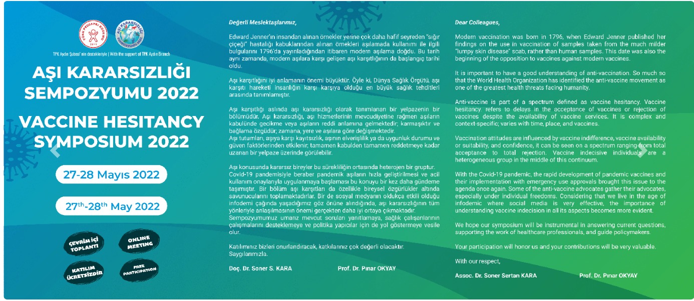 Fakültemiz öğretim üyelerinden Prof. Dr. Pınar OKYAY ve Doç. Dr. Soner S. KARA’nın eş başkanlığını yürütmekte olduğu “Aşı Kararsızlığı Sempozyumu” 27-28 Mayıs 2022 tarihlerinde Türkçe-İngilizce simultene tercüme eşliğinde çevrimiçi olarak gerçekleştirilecektir.