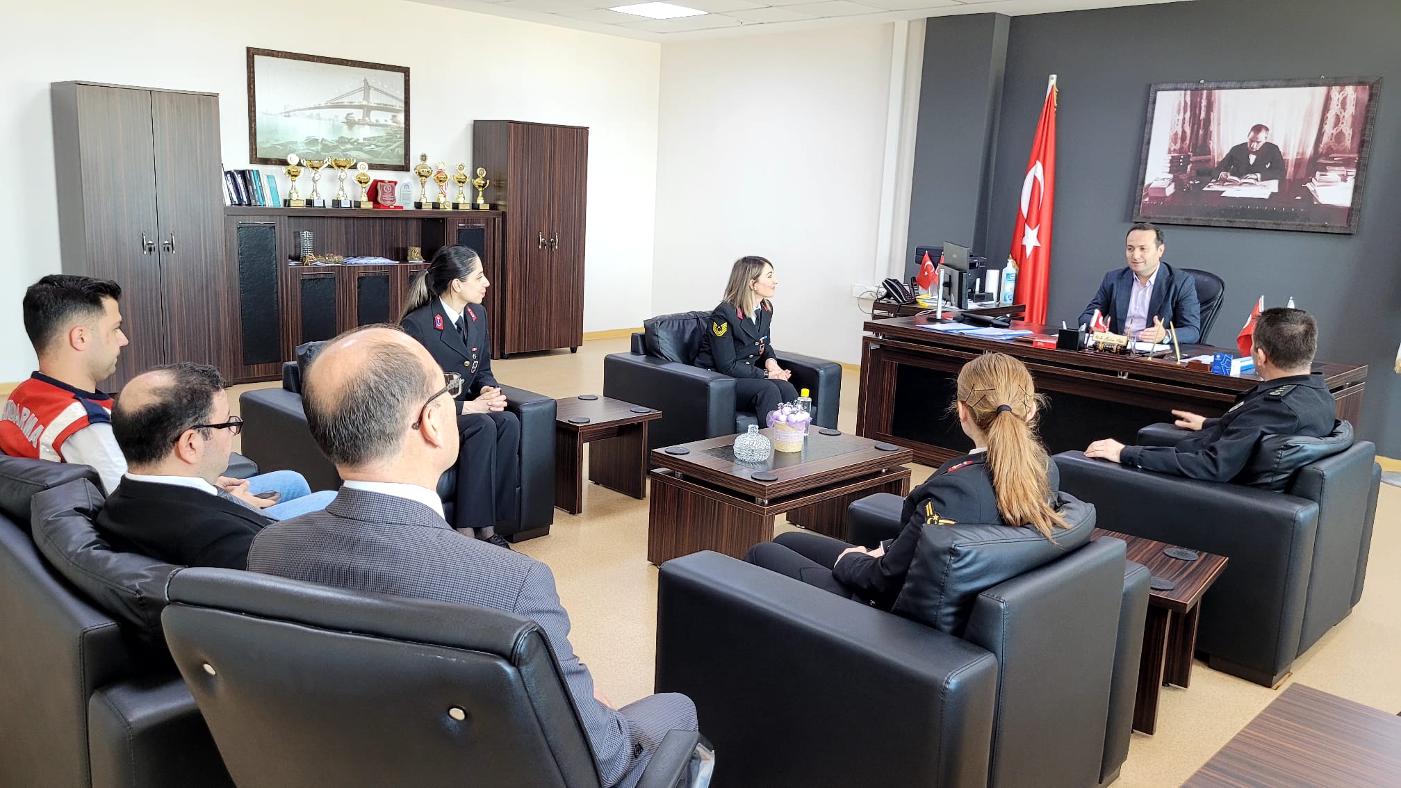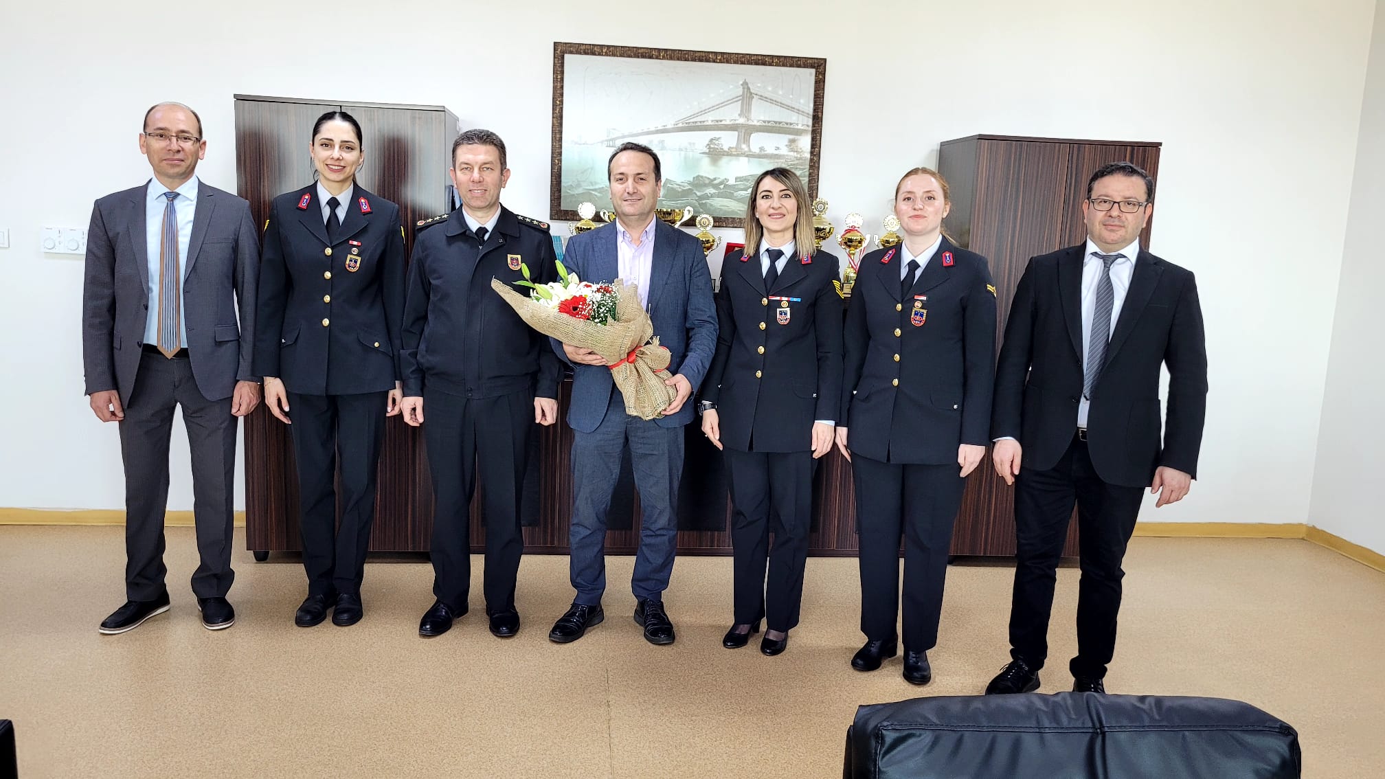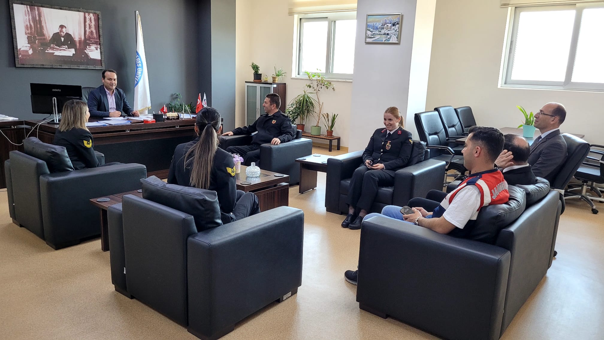 Aydın İl Jandarma Komutanlığı Asayiş Şube Müdürü Jandarma Albay Mustafa KARAGÖZ, J. Asb. Kd. Üçvş. Gizem KOÇAK, J. Asb. Üçvş. Tuğçe ÇELİK, J. Asb. Çvş. Kübra GÜNEL 14 Mart Tıp Bayramı vesilesiyle Dekanlığımıza ziyarette bulunmuşlardır.