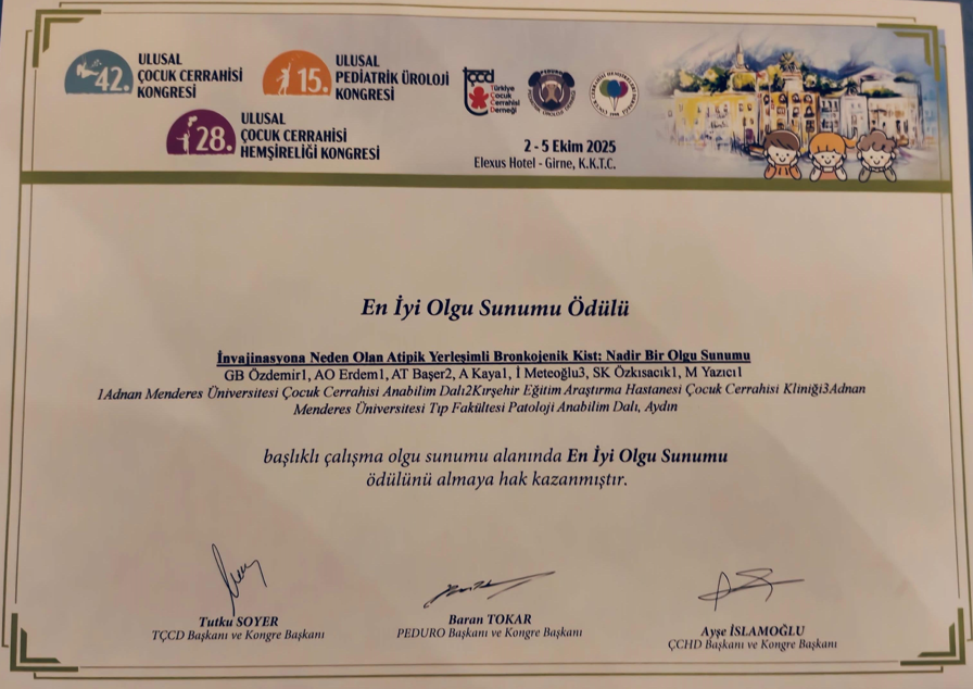 Bu yıl düzenlenen 42. Ulusal Çocuk Cerrahisi Kongresi’nde, Çocuk Cerrahisi Kliniğimiz tarafından hazırlanan olgu sunumu “En İyi Olgu Sunumu Ödülü” almıştır. Bu başarı nedeniyle öğretim üyelerimizi ve emeği geçen tüm ekip üyelerini tebrik ederiz.