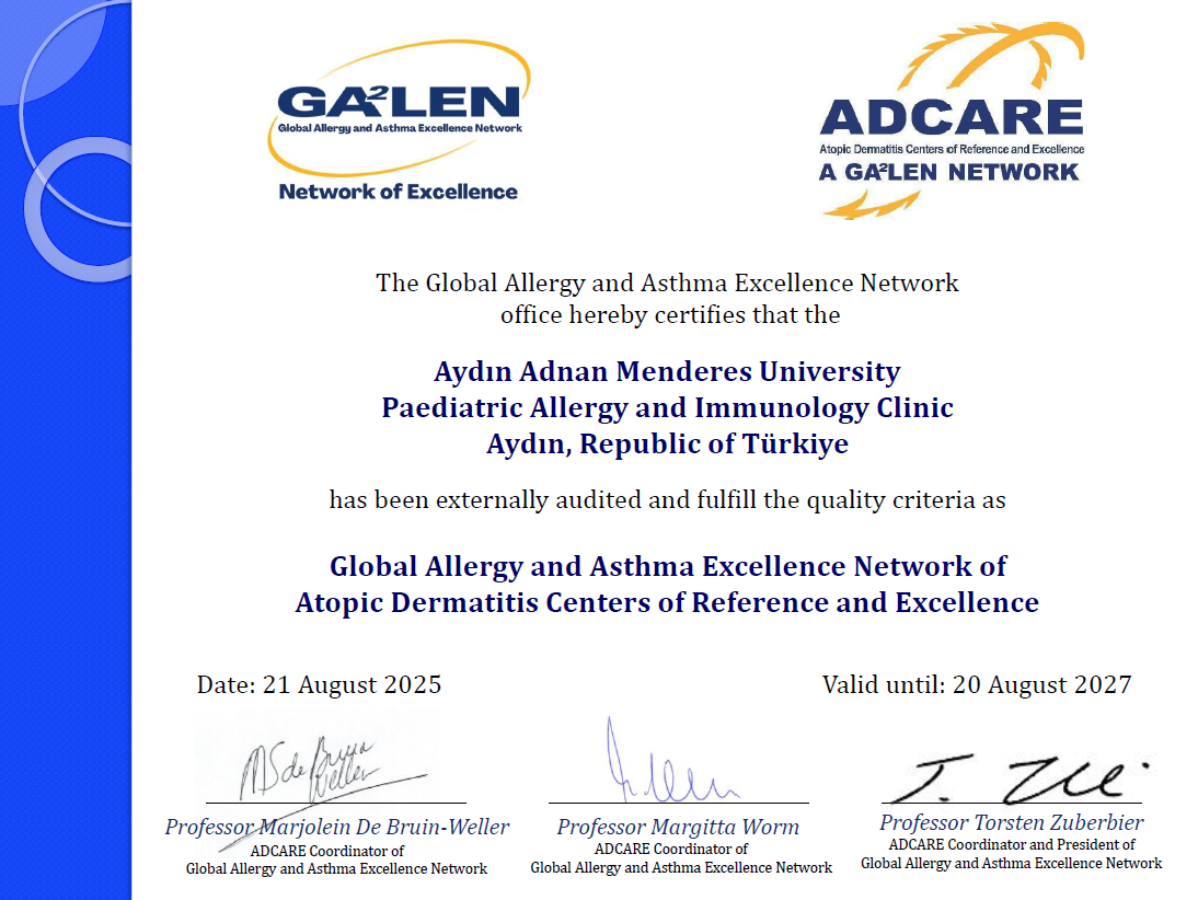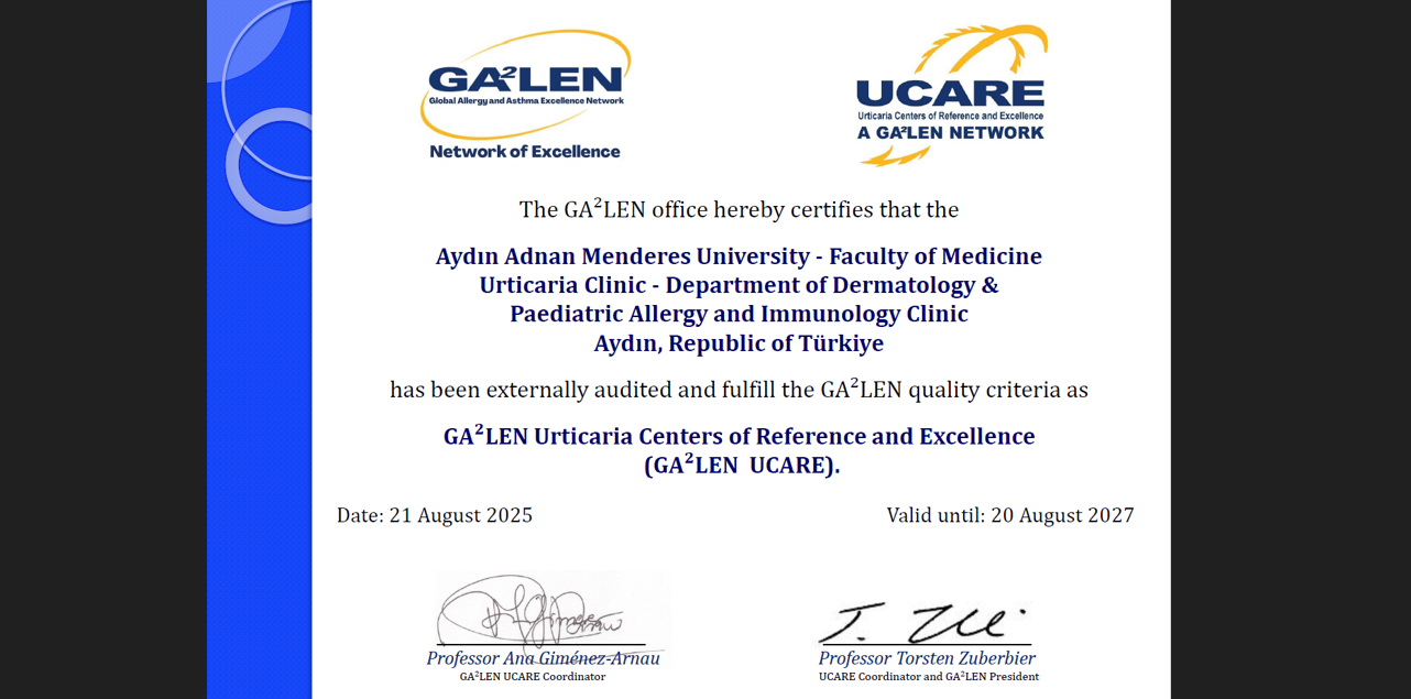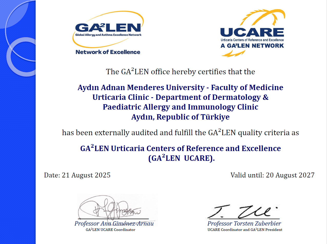 Fakültemiz Çocuk Sağlığı ve Hastalıkları Ana Bilim Dalı Çocuk İmmünolojisi ve Alerji Hastalıkları Bilim Dalımız Ürtiker Referans ve Mükemmeliyet Merkezi (Urticaria Centers of Reference and Excellence-UCARE) Sertifikası ve Atopik Dermatit Referans ve Mükemmeliyet Merkezi (Atopic Dermatitis Centers of Reference and Excellence- ADCARE) Sertifikası almaya hak kazandı.