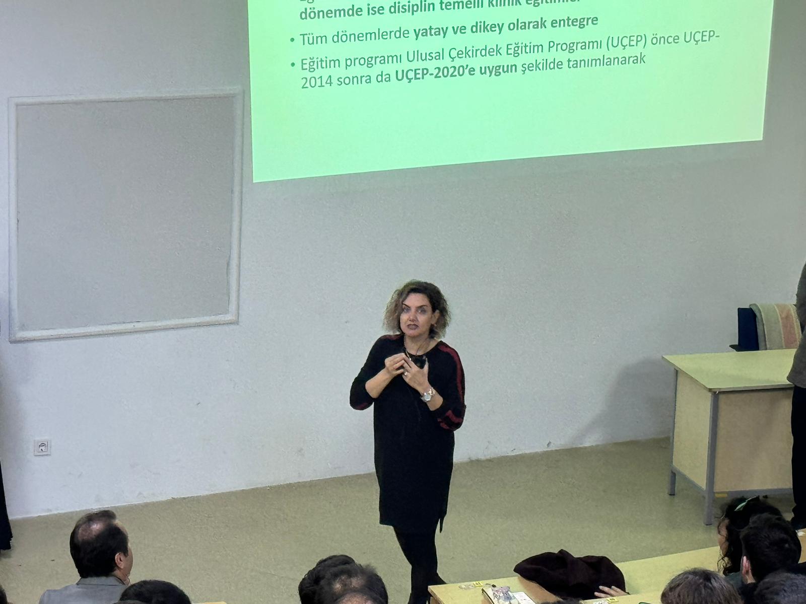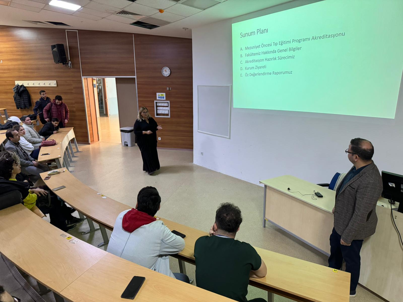 Dekanımız Prof. Dr. Ayhan AKÖZ konuÅŸmasında, eÄŸitim-öÄŸretim ile ilgili genel bilgilendirmeler yaptıktan sonra öÄŸrencilerden gelen istek, talep ve sorunları dinledi. Programın devamında Öz DeÄŸerlendirme Kurulu BaÅŸkanı Prof. Dr. Pınar OKYAY ve Dekan Yardımcısı Doç. Dr. Onur YAZICI tarafından fakültemizin Mezuniyet Öncesi Tıp EÄŸitimi Programı Akreditasyonu kapsamında öÄŸrencilere bilgilendirmelerde bulunuldu.