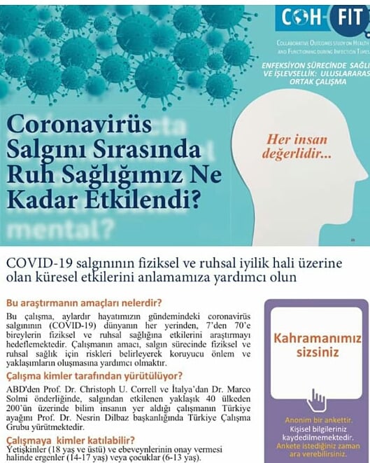 Aylardır hayatımızda çok önemli bir gündem oluşturan COVİD-19 salgın döneminin dünyanın her yerinden 7’den 70’e bireylerin ruhsal ve fiziksel sağlığına etkilerini araştırmayı hedefleyen bir çalışmadır. Çocuk ve Ergen departmanından sorumlu Doç. Dr. H. Aksu, çalışmanın amacının salgın sürecinde fiziksel ve ruhsal sağlık için riskleri belirleyerek koruyucu önlem ve yaklaşımların oluşturulmasına yardımcı olmak olduğunu ifade etti.