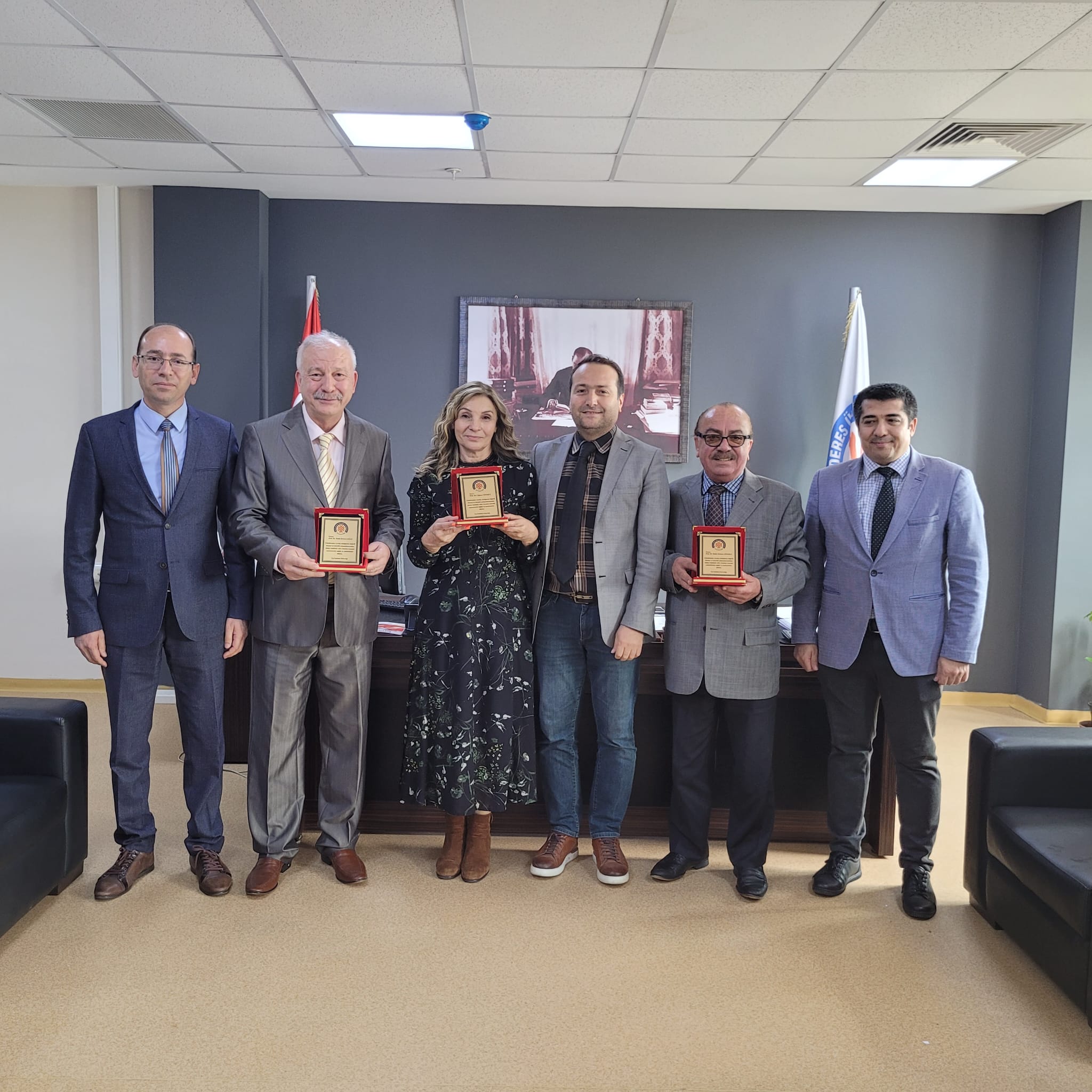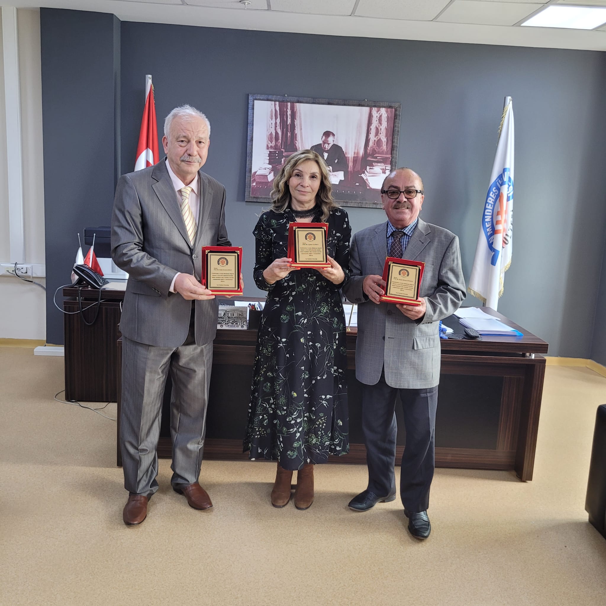 2022-2023 Eğitim-Öğretim yılı itibariyle emekliye ayrılan fakültemiz eski öğretim üyelerimizden Tıbbi Biyokimya Ana Bilim Dalından Prof. Dr. Çiğdem YENİSEY, Anatomi Ana Bilim Dalından Prof. Dr. Hulki BAŞALOĞLU, Genel Dahiliye Bilim Dalından Prof. Dr. Hulki Meltem SÖNMEZ, Çocuk Nefrolojisi Bilim Dalından Prof. Dr. Ferah SÖNMEZ ve Histoloji ve Embriyoloji Ana Bilim Dalından Doç. Dr. Kübra BAŞALOĞLU için 28.04.2023 tarihinde plaket takdimi ve veda töreni düzenlenmiştir. Törene Dekan V. Prof. Dr. Ayhan AKÖZ, Dekan Yardımcılarımız Prof. Dr. Gökhan CESUR ve Doç. Dr. Ali DUMAN katılmıştır. Prof. Dr. Ferah SÖNMEZ ve Doç. Dr. Kübra BAŞALOĞLU’nun sağlık sorunları nedeniyle katılım sağlayamadığı törende iyi dilek ve temennilerin ardından plaket takdimi gerçekleşmiş, fotoğraf çekiminin ardından tören sona ermiştir.