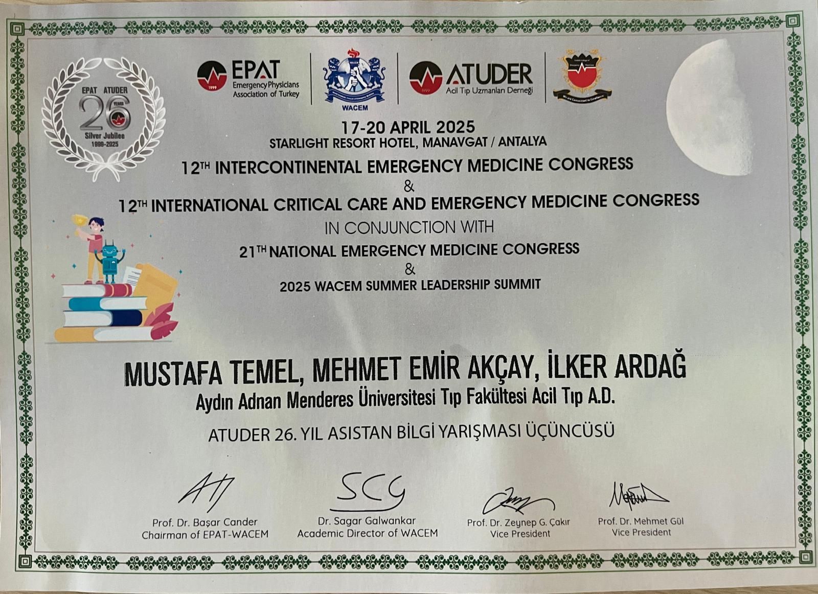 Fakültemiz Acil Tıp Ana Bilim Dalı’nda görev yapmakta olan Arş. Gör. Dr. Mustafa TEMEL, Araş. Gör. Dr. Mehmet Emir AKÇAY ve Arş. Gör. Dr. İlker ARDAĞ ATUDER 26. Yıl Asistan Bilgi Yarışması’nda üçüncülük derecesi almışlardır.