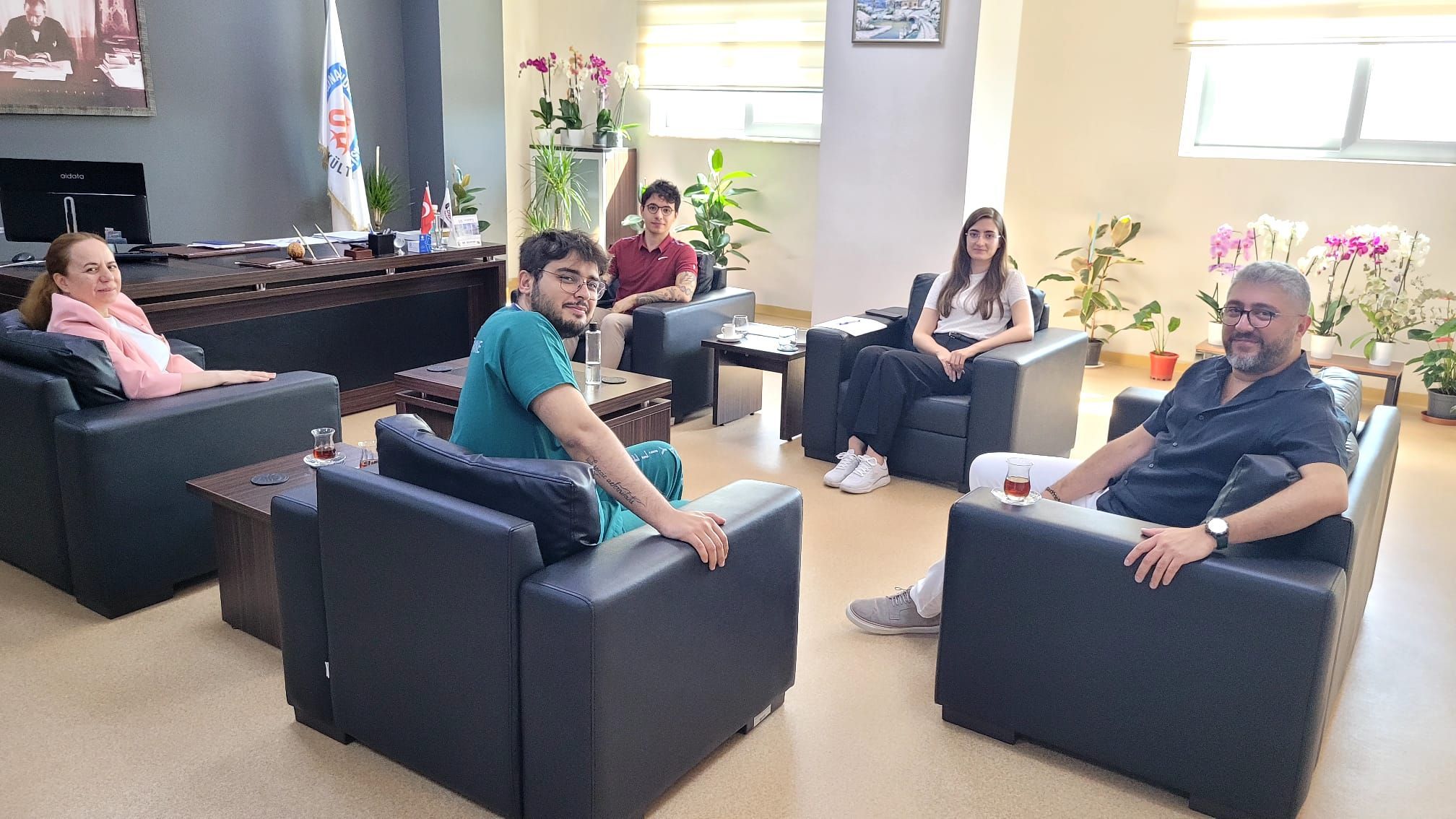 Fakültemiz Dahili Tıp Bilimleri Bölümü asistan temsilcisi Uğur Berkay İNCE, Cerrahi Tıp Bilimleri Bölümü asistan temsilcisi Ahmet Ege SAKUR ve Temel Tıp Bilimleri Bölümü asistan temsilcisi Ezgi Özden ÇELİKEL 29.08.2025 tarihinde Dekan V. Prof. Dr. Yasemin ÖZKAN’ı ve Dekan Yardımcısı Doç. Dr. Erhan ATEŞ’i Dekanlık Makamında ziyaret etti. Gerçekleşen ziyarette asistan temsilcilerinden gelen dilek, istek ve talepler alınarak çözüm önerileri konuşuldu. Asistan temsilcilerinden gelen dilek, istek ve taleplerin değerlendirilmesi amacıyla ilerleyen günlerde bir toplantı daha gerçekleştirilmesi planlandı. Ziyaret karşılıklı iyi dilek ve temennilerin iletilmesi ve fotoğraf çekimi ile sona erdi.
