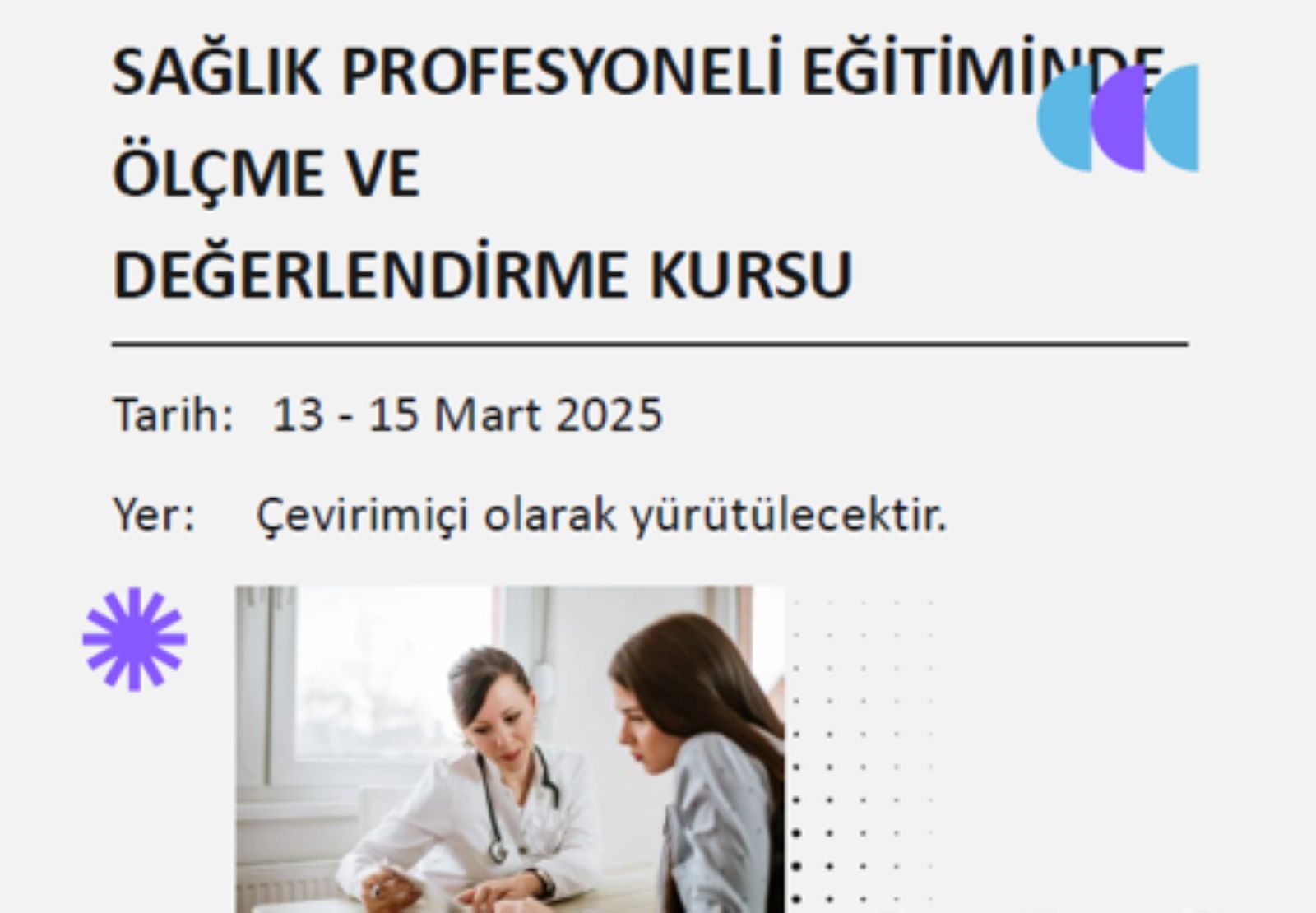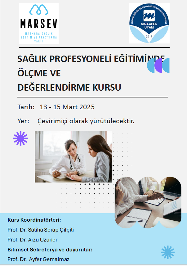 Marmara Sağlık Eğitim ve Araştırma Vakfı öğretim üyeleri ve Kurs Koordinatörü Fakültemiz Aile Hekimliği Ana Bilim Dalı öğretim üyesi Prof. Dr. Ayfer GEMALMAZ eğitmenliğinde, katılımcı öğretim üyeleri ile beraber Fakültemizde 13-15 Mart 2025 tarihleri arasında çevrimiçi Ölçme ve Değerlendirme Kursu düzenlenmiştir.