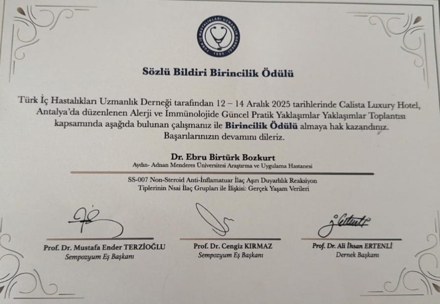 Fakültemiz İmmünoloji ve Alerji Hastalıkları Bilim Dalı (İç Hastalıkları), “Alerji ve İmmünolojide Güncel Pratik Yaklaşımlar” Toplantısı kapsamında gerçekleştirilen sözlü bildiri oturumunda Birincilik Ödülü kazanmıştır.