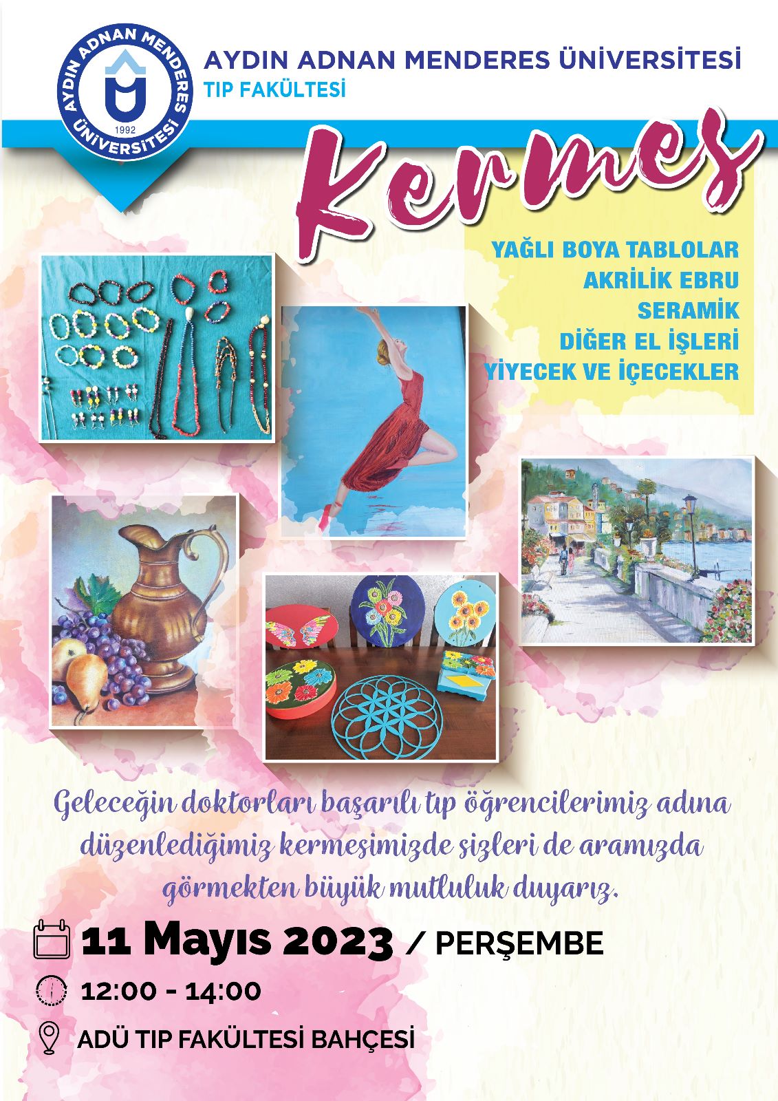 11 Mayıs 2023 PerÅŸembe günü12:00-14:00 saatleri arasında Fakültemiz bahçesinde geleceÄŸin doktorları baÅŸarılı tıp öÄŸrencileri yararına geleneksel kermes etkinliÄŸi düzenlenecektir. Tüm üniversite personelimiz davetlidir.