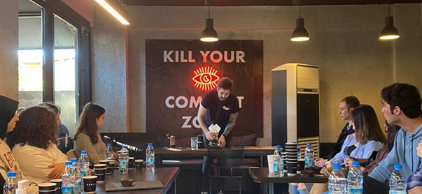 Fakültemiz öğrenci topluluklarından EMSA Aydın “IV. Geleneksel Kahve Tadım Etkinliği” gerçekleştirdi. Etkinlikte kahve meyvesi çayı olarak bilinen Cascara çayı, filtre kahve, espresso shot ve chemex/v60 ile demlenmiş kahve; kahve ile tatlı arasındaki asidik aroma benzerliğinin fark edilebilmesi için de bir adet tatlı tadımı yapıldı. Öğrencilerimiz etkinlik esnasında kahve kültürünün ilginç hikayesini dinleyip, kahve ekipmanları ile kahvenin nasıl demlendiğini öğrenirken aynı zamanda da kahve hakkında merak ettikleri sorulara yanıt alarak etkinliği tamamladılar.