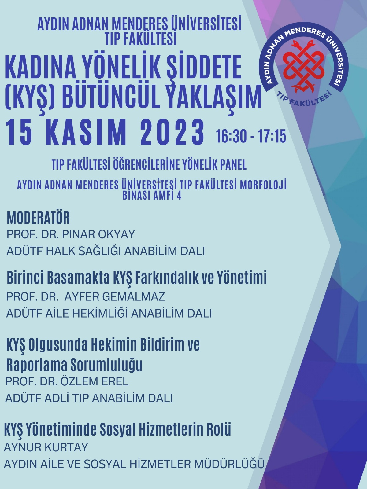 Tıp Fakültesi Morfoloji Binası Amfi-4’te 15 Kasım 2023 tarihinde saat 16:30-17:15 saatleri arasında “Kadına Yönelik Åžiddete Bütüncül Yaklaşım” konulu panel düzenlenecektir.