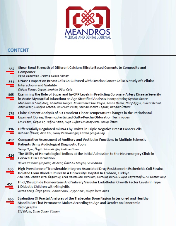 Aydın Adnan Menderes Üniversitesi Tıp Fakültesi ve DiÅŸ HekimliÄŸi Fakültesinin ortak bilimsel yayın organı olan Meandros Medical and Dental Journal, 2024 yılının Aralık sayısını okuyucularıyla buluÅŸturdu. Disiplinler arası akademik çalışmalara ev sahipliÄŸi yapan dergi, tıp ve diÅŸ hekimliÄŸi alanında yenilikçi ve güncel araÅŸtırmaları bilim dünyasına sunmaya devam ediyor. Derginin yeni sayısına resmi web sitesinden eriÅŸilebilir. Web sitesi için TIKLAYINIZ