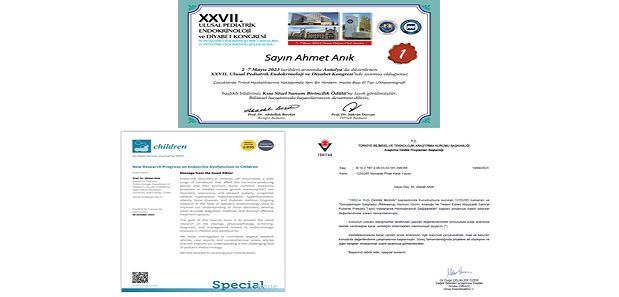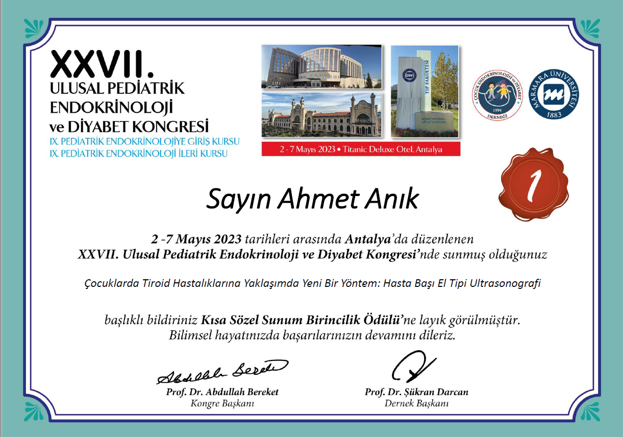 Çocuk Endokrinolojisi Bilim Dalı Öğretim Üyesi Prof. Dr. Ahmet ANIK ve Radyoloji Anabilim Dalı Öğretim Üyeleri Doç. Dr. Mustafa GÖK ile Dr. Öğr. Üyesi Göksel TUZCU'nun çalışması "Çocuklarda Tiroid Hastalıklarına Yaklaşımda Yeni Bir Yöntem: Hasta Başı El tipi Ultrasonografi" çalışması XXVII. Ulusal Pediatrik Endokrinoloji ve Diyabet Kongresi'nde Kısa Sözel Sunum Birincilik Ödülü almıştır.