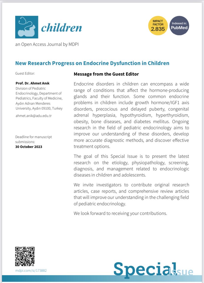 Çocuk Endokrinolojisi Bilim Dalı öğretim üyesi Prof. Dr. Ahmet ANIK, Children dergisinin "New Research Progress on Endocrine Dysfunction in Children" isimli özel sayısının editörü olmuştur. Kendisini kutlar, akademik çalışma ve başarılarının devamını dileriz.