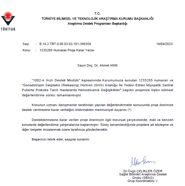 Yürütücülüğünü Prof. Dr. Ahmet ANIK’ın yaptığı ve araştırmacıları arasında Çocuk Endokrinolojisi’nden Dr. Reyhan DEVECİ SEVİM ve Dr. Sebla GÜNEŞ, Radyoloji Anabilim Dalı’ndan Doç. Dr. Mustafa GÖK’ün yer aldığı “Gonadotropin Salgilatici (Releasing) Hormon (Gnrh) Analoğu İle Tedavi Edilen İdiyopatik Santral Puberte Prekoks Tanili Hastalarda Hemodinamik Değişiklikler” isimli çalışma Tübitak 1002 desteği almaya hak kazanmıştır.