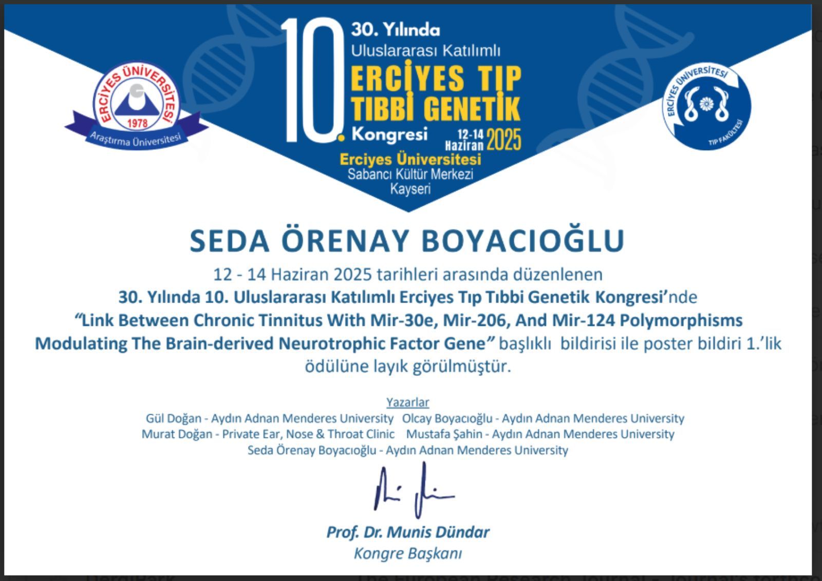 Fakültemiz Tıbbi Genetik Ana Bilim Dalı Öğretim Üyesi Prof. Dr. Seda Örenay Boyacıoğlu ve çalışma arkadaşları, 12-14 Haziran 2025 tarihleri arasında düzenlenen 10. Uluslararası Katılımlı Erciyes Tıp Tıbbi Genetik Kongresi'nde sundukları “Link Between Chronic Tinnitus with miR-30e, miR-206, and miR-124 Polymorphisms Modulating the Brain-derived Neurotrophic Factor Gene” başlıklı çalışmalarıyla poster birincilik ödülüne layık görülmüştür.