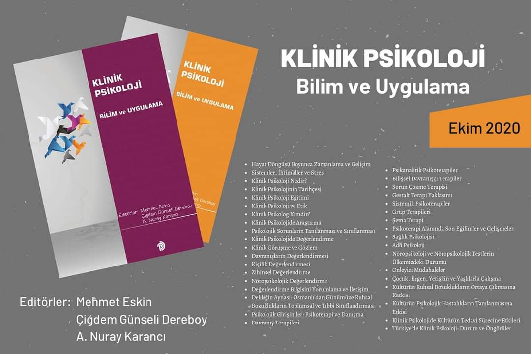 Fakültemiz Ruh Sağlığı ve Hastalıkları Anabilim Dalı Öğretim Üyesi Prof.Dr. Çiğdem Dereboy ve aynı Anabilim dalı emekli Öğretim Üyesi Prof. Dr. Mehmet Eskin'in editörlerinden olduğu ‘Klinik Psikoloji Bilim ve Uygulama Kitabı’, Türk Psikologlar Derneği tarafından yayımlandı.