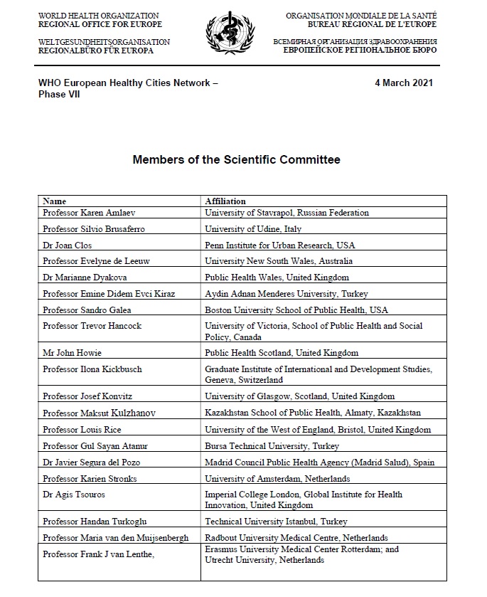 20 kişiden oluşan Bilim Kurulu, DSÖ Avrupa Sağlıklı Şehirler ağının gelişmesinde görev alacak olup; Sağlıklı Şehir olmak için başvuran Avrupa Bölgesi belediyelerini ve ağlarını değerlendirecekler, DSÖ Avrupa Sağlıklı Şehirler Ağı tarafından yapılacak çalışmalara uzmanlık alanlarında katkı vereceklerdir.