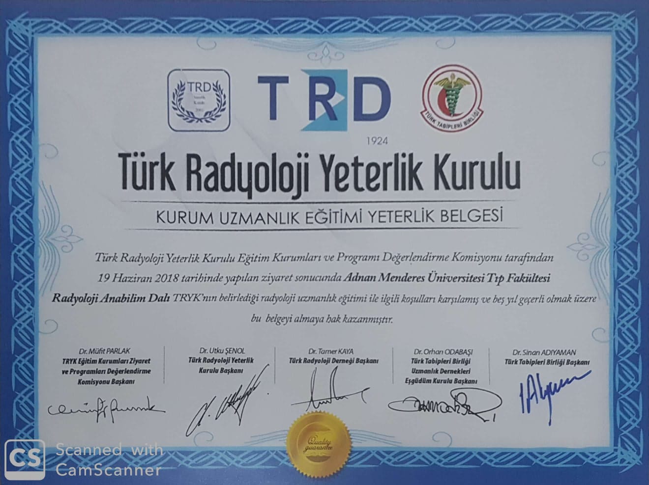 Türk Radyoloji Yeterlik Kurulu (TRYK) tarafından 19 Haziran 2018 tarihinde yapılan kurum ziyareti ve değerlendirme sonrasında “Uzmanlık Eğitimi Yeterlik Belgesi” almaya hak kazanan Üniversitemiz Tıp Fakültesi Radyoloji Anabilim Dalı’na, 27 Aralık 2019 tarihinde düzenlenen tören ile yeterlik belgesi resmen teslim edildi.