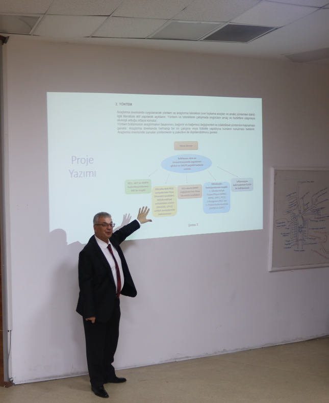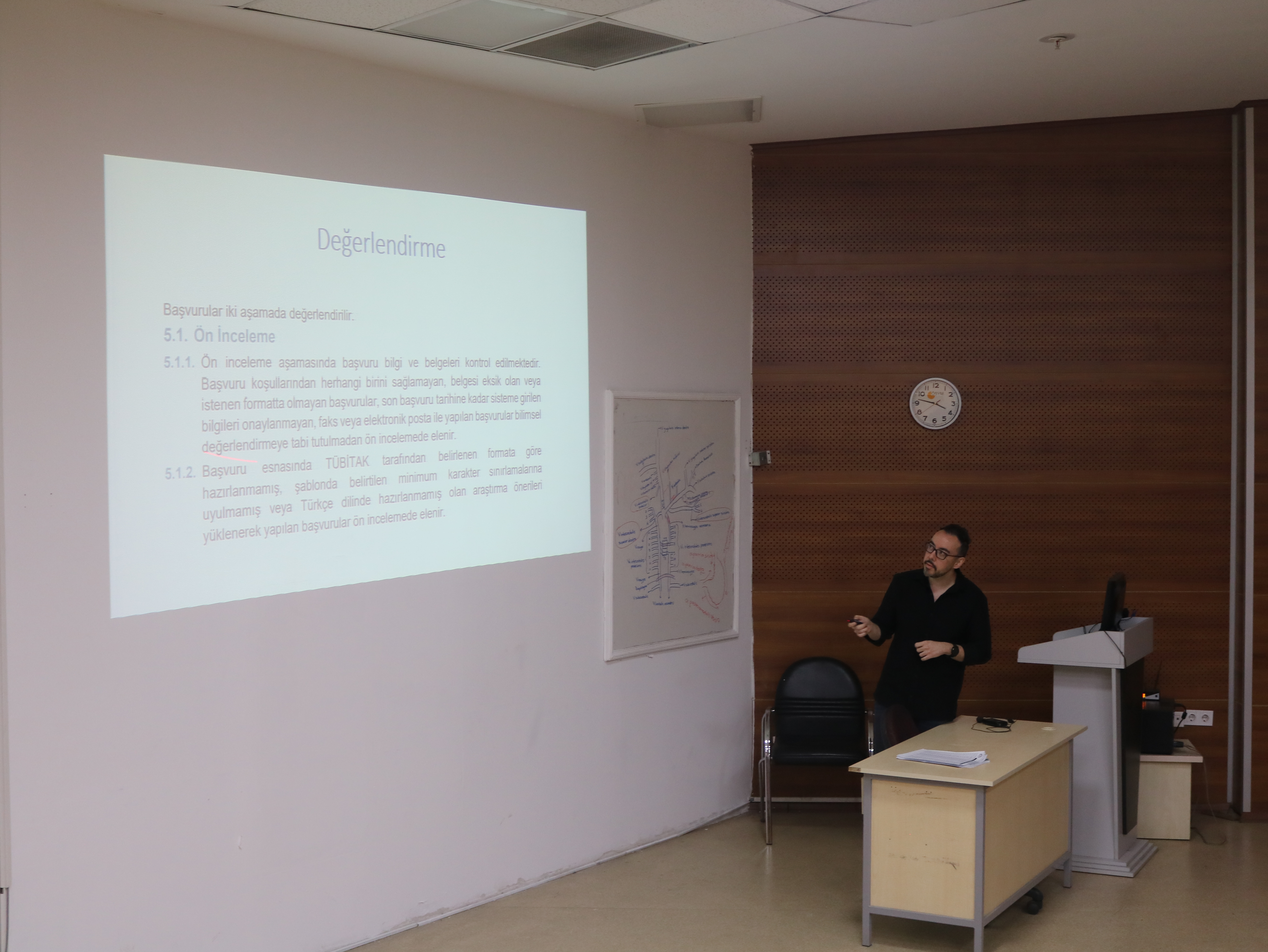 Toplantı, Biyofizik Anabilim Dalı BaÅŸkanı Prof. Dr. Mehmet Dinçer Bilgin ve Tıbbi Biyoloji Anabilim Dalı ArÅŸ. Gör. Dr. Umut Kerem Kolaç tarafından yürütüldü. Katılımcılara, proje hazırlama süreci, baÅŸvuru adımları ve deÄŸerlendirme kriterleri hakkında bilgiler verildi.