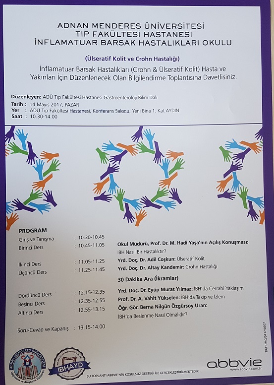 Tıp Fakültesi, Gastroenteroloji Bilim Dalımız tarafından 14.5.2017 pazar günü, organize edilen sempozyumda öÄŸretim üyelerimiz hastalarıyla buluÅŸtu. ADÜ Tıp Fakültesi konferans salonunda yapılan İBH (Ülserstif Kolit ve Crohn) Sempozyumuna Aydın ve ilçelerinin yanısıra İzmir, Denizli, MuÄŸla ve Manisa gibi çevre illerimizden yaklaşık 250'nin üzerinde hasta katıldı. Türkiye'de hastalarla yapılmış en büyük toplantılardan biri olma özelliÄŸi taşıyan ve 6 öÄŸretim üyesinin konuÅŸmacı olduÄŸu sempozyum, Anneler Günü olmasına raÄŸmen çok büyük ilgi gördü.