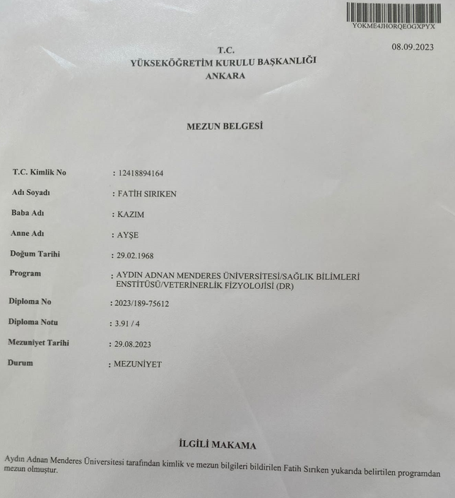 Üniversitemiz Hastanesi’nde diyetisyen olarak görev yapmakta olan Fatih SIRIKEN, Üniversitemiz Sağlık Bilimleri Enstitüsü Veterinerlik Fizyolojisi programında doktora öğrenimini başarı ile tamamlayarak mezun olmuştur. Kendisini tebrik eder, bundan sonraki çalışma hayatında başarılar dileriz.