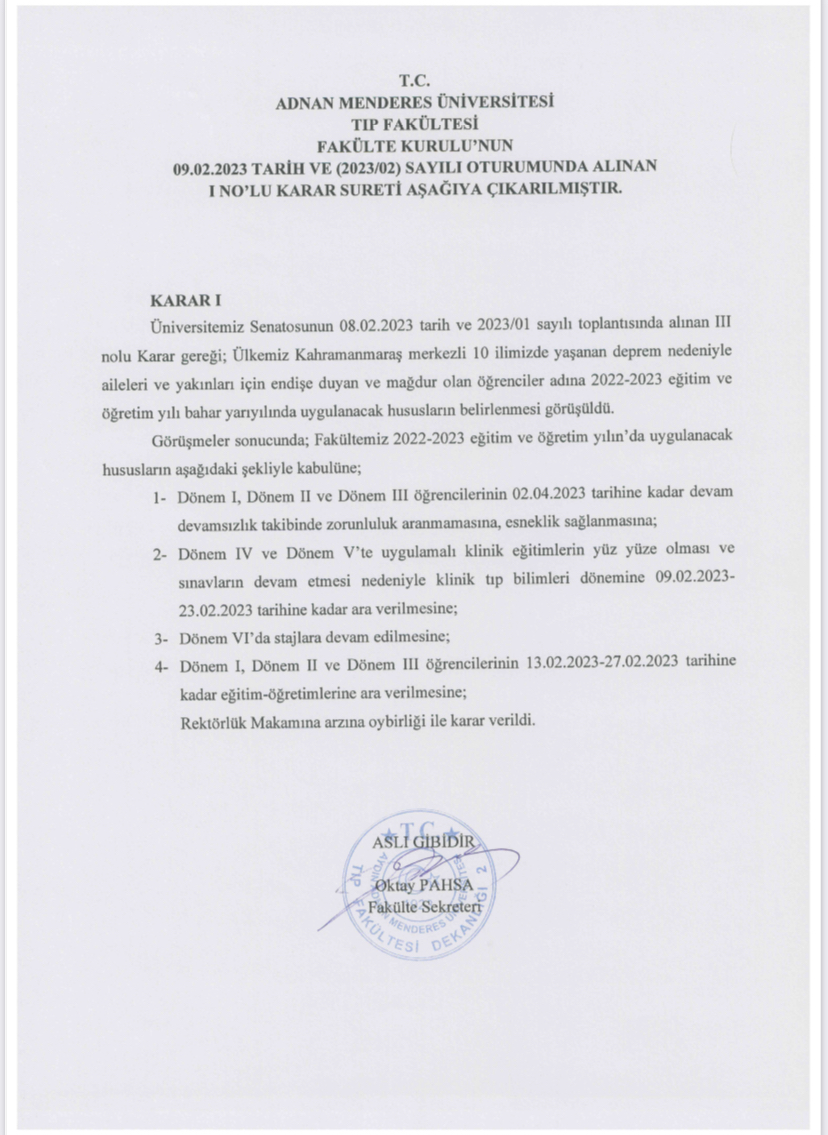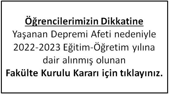 Yaşanan Depremi Afeti nedeniyle 2022-2023 Eğitim-Öğretim yılına dair alınmış olunan Fakülte Kurulu Kararı