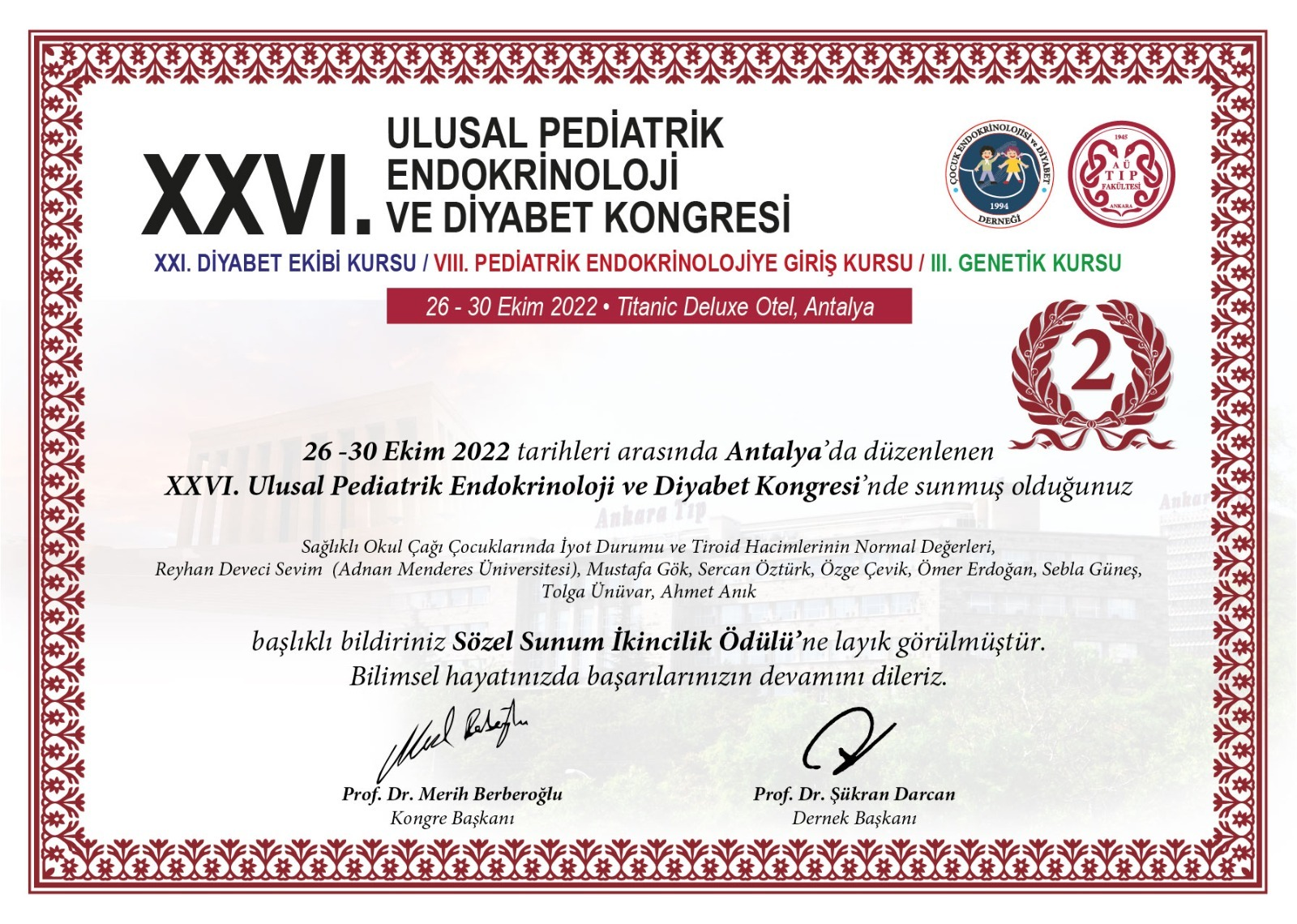"Thyroid volumes of school-age children" isimli akademik çalışmada, saha çalışmasında veri toplama kısmında öÄŸrencimiz Utku AÄžCA görev almış olup, bu çalışma "Ulusal Pediatrik Endokrinoloji ve Diyabet Kongresi"nde sözel ikincilik ödülü almış, aynı çalışma "Journal of Pediatric Endocrinology and Metabolism" dergisinde deÄŸerlendirme aÅŸamasındadır.
