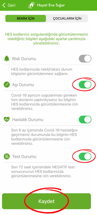 Aşı yaptırmayan veya negatif PCR test sonucu olmayan öğrencilere ek olarak, OBİS’te aşı bilgisi ve negatif PCR test sonucu görüntülenemeyen öğrenciler de yüz yüze derslere katılamayacağından, bu bilglerin OBİS’te görüntülenebilmesi için “Hayat Eve Sığar” uygulamasında, “Aşı Durumu” ve “Test Durumu” izinlerinin aşağıdaki görselde olduğu şekilde AÇIK olarak ayarlanması gerekmektedir.