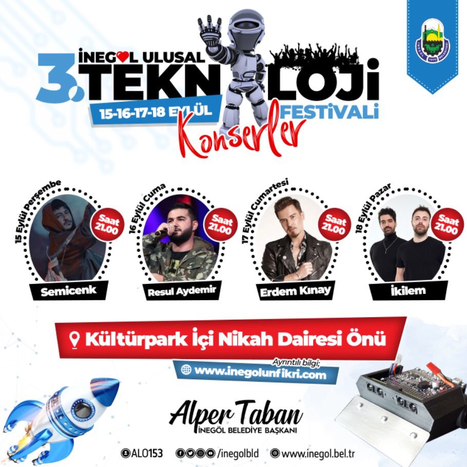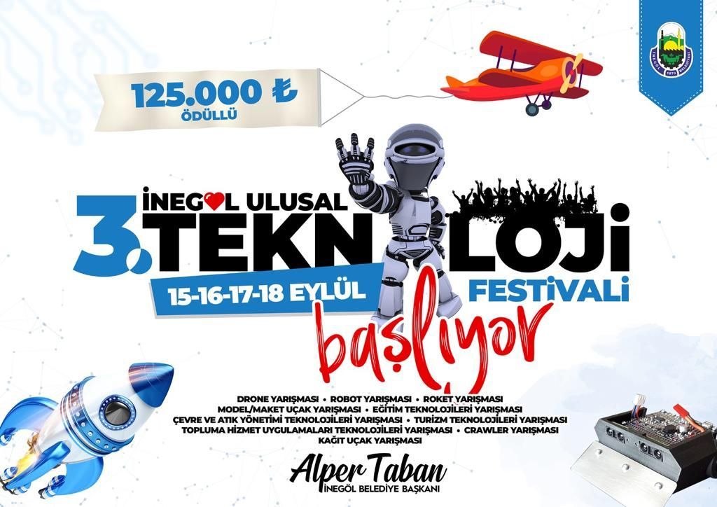 Ülkemizin yerel yönetimler düzeyinde konsepti ile tek festivali, “3. Ulusal Teknoloji Festivali” 15- 18 Eylül tarihlerinde İnegöl’de gerçekleştirilecektir. Festival kapsamında; (10) yarışma kategorisinde toplam 125.000 TL ödül verilecektir. “Yerli ve Milli Teknoloji” hamlesine katkı sunmak amacıyla proje sunumlarının, kurumsal firma sergilerinin, stantların, konserlerin, kariyer söyleşilerinin, yarışmaların, performans alanlarının ve birçok farklı etkinliğin düzenleneceği festivalde, yarışma ve stant başvuruları için son başvuru tarihi: 08 Ağustos 2022’dir. Başvuru ve diğer detaylar için buradan ziyaret edebilirsiniz.