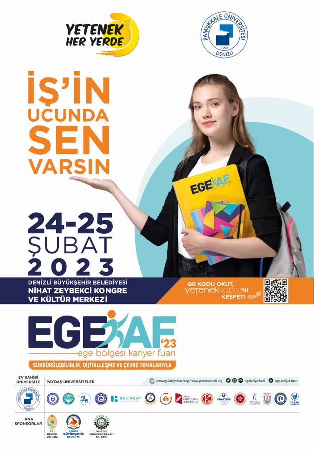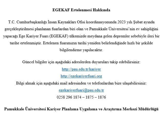 Türkiye Cumhuriyeti Cumhurbaşkanlığı İnsan Kaynakları Ofisi himayesi ve koordinasyonunda Pamukkale Üniversitesi ev sahipliğinde, ADÜ'nün de dahil olduğu Ege Bölgesi'ndeki 15 paydaş üniversitenin katılımı ile 24-25 Şubat 2023 tarihlerinde Denizli Büyükşehir Belediyesi Nihat Zeybekci Kongre ve Kültür Merkezi'nde gerçekleştirilecek olan Ege Bölgesi Kariyer Fuarı'yla ilgili detaylı bilgiye https://www.egekariyerfuari.org/ adresinden ulaşabilirsiniz.