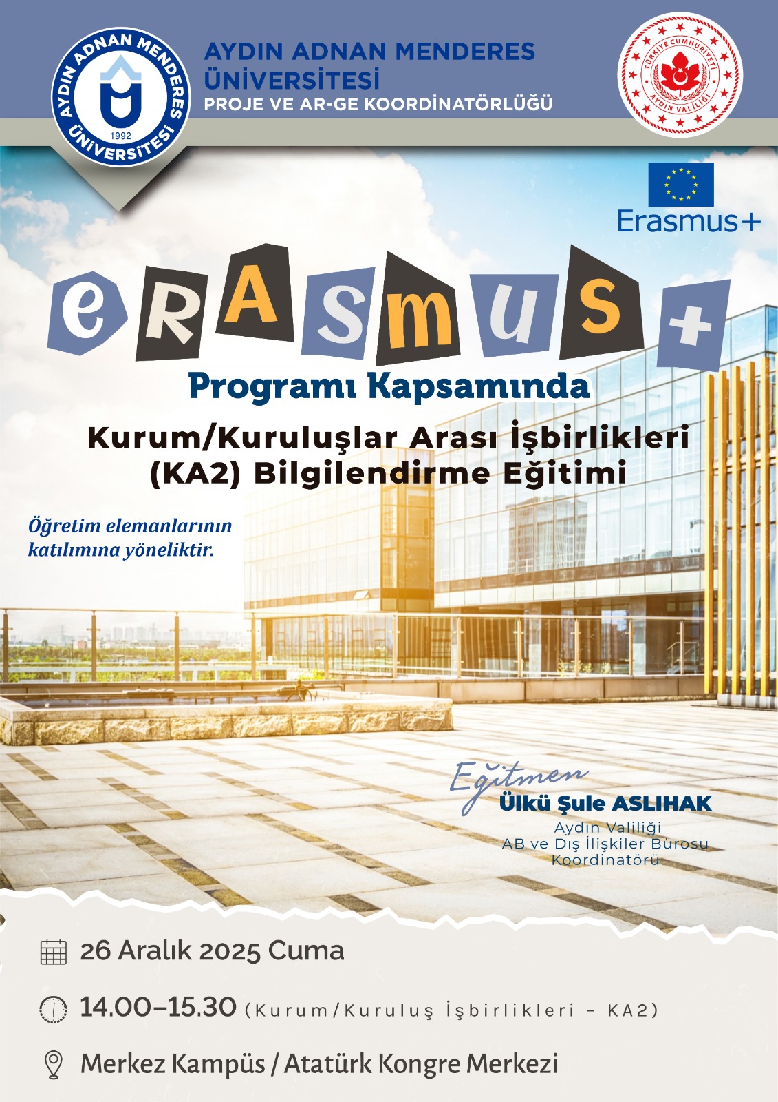 Bu eğitimin amacı, Erasmus+ KA1 ve KA2 proje türlerine ilişkin temel bilgileri aktarmak, başvuru süreçlerinde dikkat edilmesi gereken noktaları açıklamak ve katılımcıların proje geliştirme becerilerini desteklemektir.