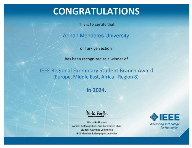 140 yıllık geçmişi ile dünyanın en eski ve en büyük mesleki organizasyonu olan IEEE (Institute of Electrical and Electronics engineering), 190 ülkede 460 bin üyeye sahiptir. Yaklaşık 100 ülkede, 3635 aktif öğrenci topluluğu ve 171 bin öğrenci üyesi ile üniversite öğrencileri arasında da küresel bir topluluktur. Dünya genelinde faaliyet gösteren 3635 IEEE öğrenci topluluğu arasında yer alan "ADÜ IEEE", IEEE Member and Geographic Activities tarafından verilen 2024 yılı Bölgesel Örnek Öğrenci Kolu Ödülüne layık görülerek, üniversitemizin adını uluslararası alanda gururla temsil etmiştir.