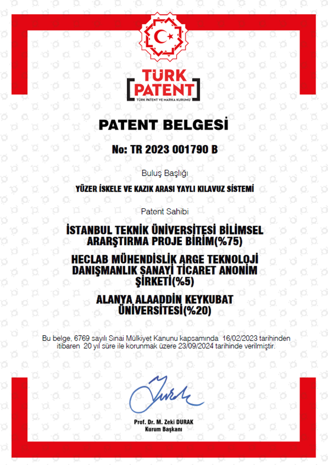 Deniz ortamında, özellikle de limanlarda kıyıya dik olarak tasarlanan yüzer platformların, fırtına koşullarında yerleştirildikleri konumda tutulması inşaat endüstrisinde önemli bir problem olarak karşımıza çıkıyor. Prof. Dr. Oral Yağcı ve ekip arkadaşları tarafından geliştirilen ve patent almaya hak kazanan “YÜZER İSKELE VE KAZIK ARASI YAYLI KILAVUZ SİSTEMİ” başlıklı tasarım, yüzer platformların konumunu kontrol eden düşey kazıklar ile yüzer platformlar arasındaki bağlantıyı sağlayan yenilikçi bir ürün olarak ortaya çıkıyor. İnşaat endüstrisinde özellikle kıyı yapılarının imalatında avantaj sağlayan ürün ile dalga hareketi sırasında yüzer platform bağlantı elemanları ile kılavuz kazıklar arasındaki belirli noktalarda gelişen ani gerilme yığılmalarının ve bunun yarattığı yapısal hasarın önüne geçilmesi hedefleniyor.