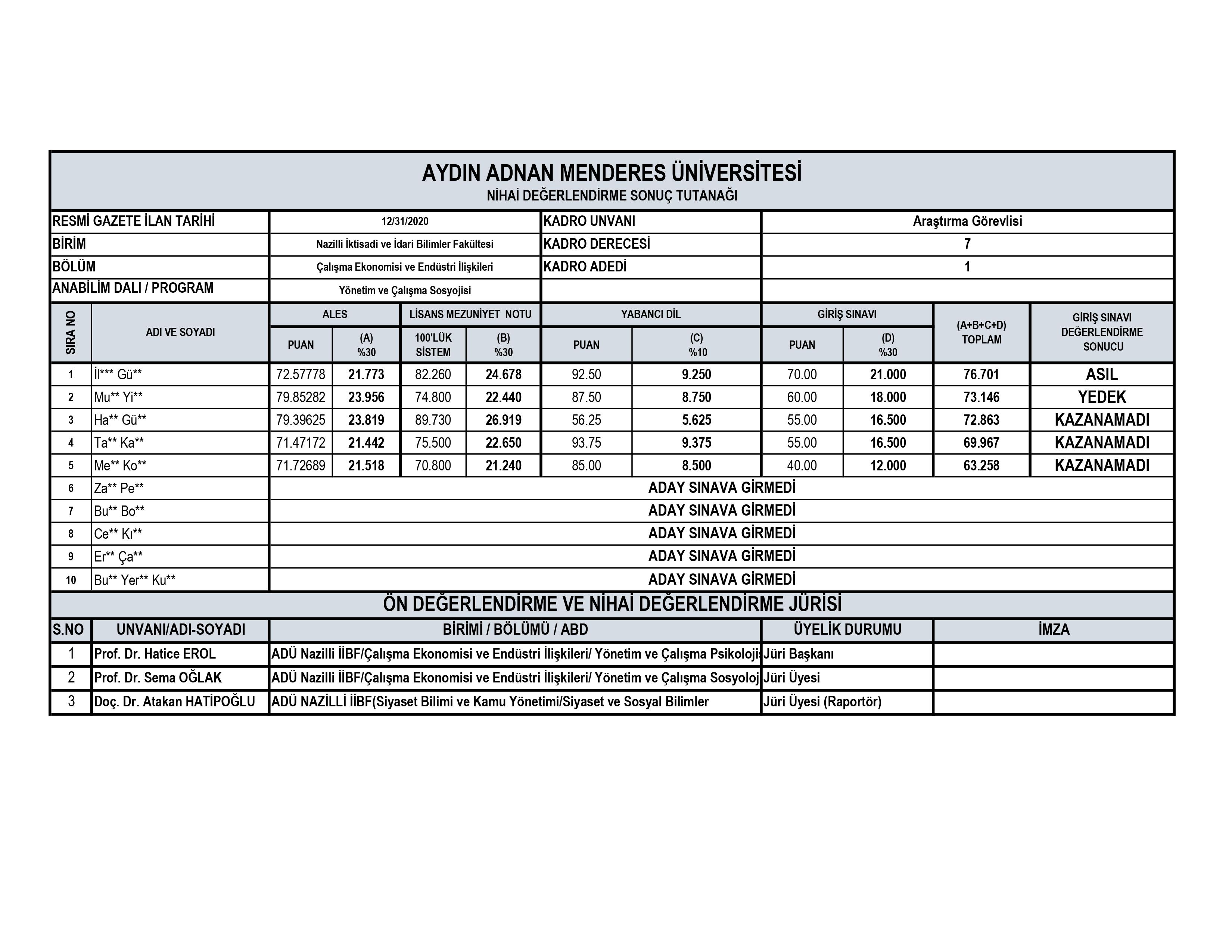“Öğretim Üyesi Dışındaki Öğretim Elemanı Kadrolarına Naklen veya Açıktan Yapılacak Atamalarda Uygulanacak Merkezi Sınav ile Giriş sınavlarına İlişkin Usul ve Esaslar Hakkında Yönetmelik” Hükümleri uyarınca Aydın Adnan Menderes Üniversitesi Nazilli İktisadi ve İdari Bilimler Fakültesi Çalışma Ekonomisi ve Endüstri İlişkileri Bölümü Yönetim ve Çalışma Sosyolojisi Anabilim Dalı Araştırma Görevlisi kadrosu Nihai Değerlendirme Sonucu aşağıdaki gibidir.