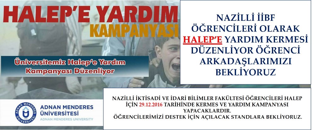 Fakültemiz öğrencilerinin HALEP’te insanlık dışı zulme uğrayan kardeşlerimiz için 29/12/2016 PERŞEME günü düzenleyeceği KERMES VE İNSANİ YARDIM KAMPANYASI'na, başta öğrencilerimiz olmak üzere tüm akademik ve idari personelimizin katılımını bekliyoruz.