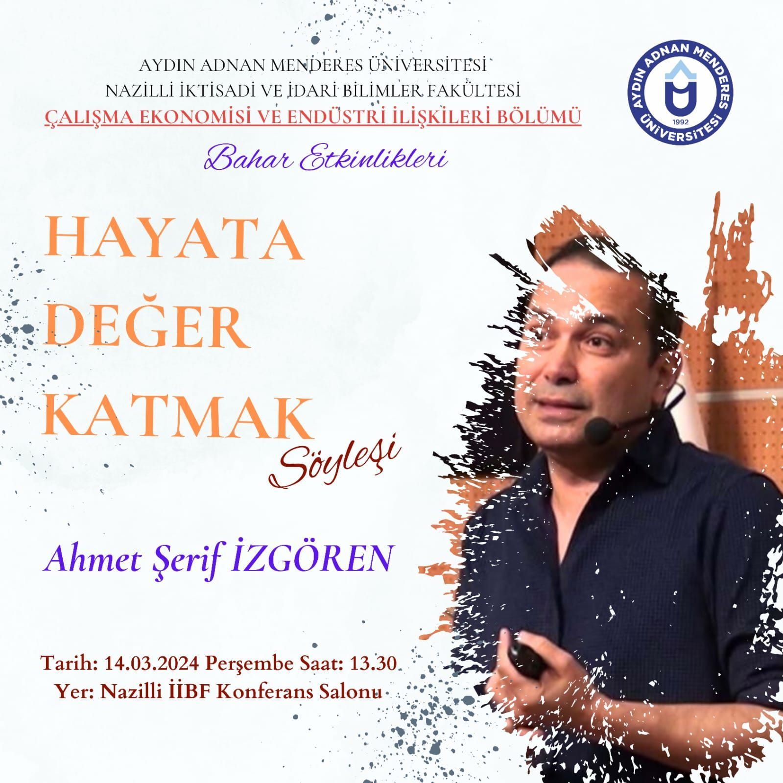 Fakültemizde 14 Mart 2024 tarihinde saat 13.30'da gerçekleşecek olan "Hayata Değer Katmak" başlıklı söyleşiye sizleri Ahmet Şerif İZGÖREN'in konuşmacı olarak katılacağı etkinliğimize davet etmekten mutluluk duyuyoruz. Tüm akademisyenlerimiz ve öğrencilerimizin bu değerli etkinliğe katılımlarını bekliyoruz.