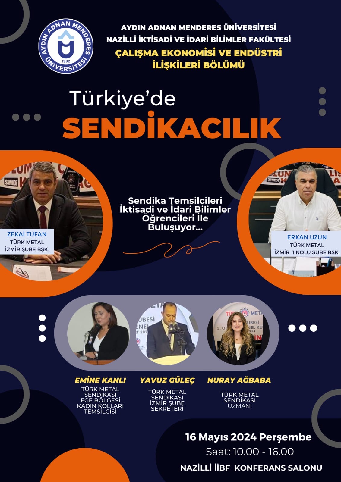 Nazilli İktisadi ve İdari Bilimler Fakültesi'nde, Çalışma Ekonomisi ve Endüstri İlişkileri Bölümü tarafından Türk-Metal Sendikası İzmir Şubesi katılımıyla 16 Mayıs 2024 Perşembe günü, saat 10.00-16.00 arasında, Nazilli İİBF Konferans Salonu'nda "Türkiye'de Sendikacılık" konulu çoklu panel düzenlenecektir.