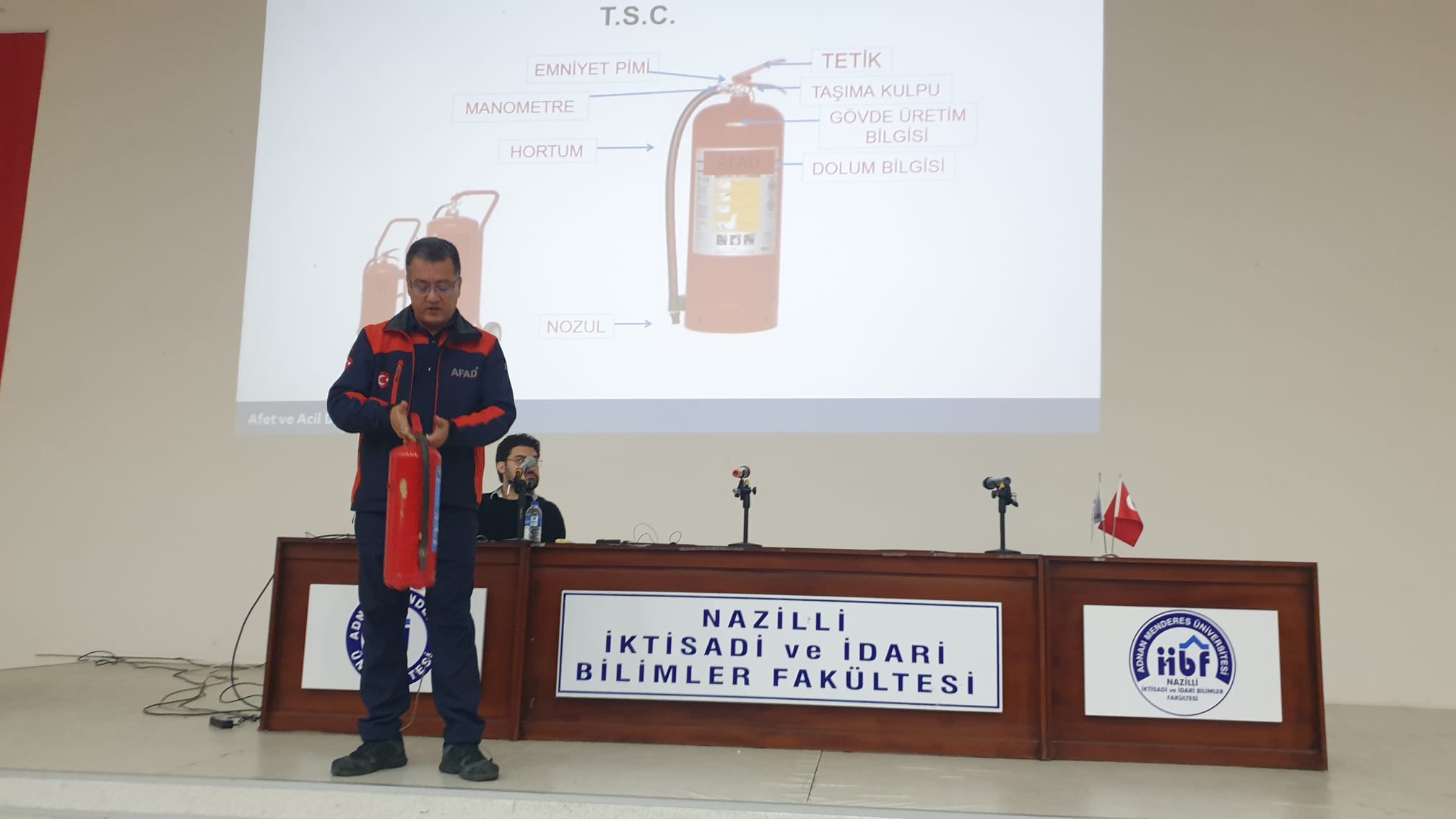 AFAD Aydın İl Müdürlüğü tarafından verilen 5 günlük teorik ve pratik eğitimde öğrenciler afetler, afet yönetimi, ilk yardım, yangına müdahale, yaralı taşıma, çadır kurma, insani yardım konularında eğitim aldılar. Eğitimin ardından yapılan sınavda başarılı olan öğrenciler AFAD Destek Gönüllüsü Sertifikası almaya hak kazandı. Eğitimin ilk gününde Kızılay Aydın İl Müdürlüğü de öğrencilere ikramda bulundu. Siyaset Bilimi ve Kamu Yönetimi Bölüm Başkanı Prof. Dr. F. Neval Genç, ilgili kurumların işbirliği ile eğitimlerin her yıl devam edeceğini belirterek, öğrencilerin afetlere hazırlıklı bireyler olarak yetişmesinin önemine dikkat çekti.