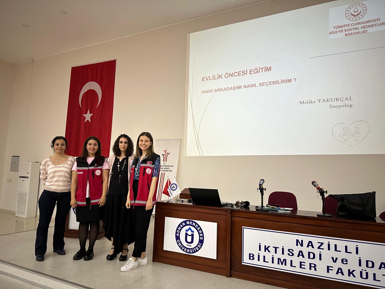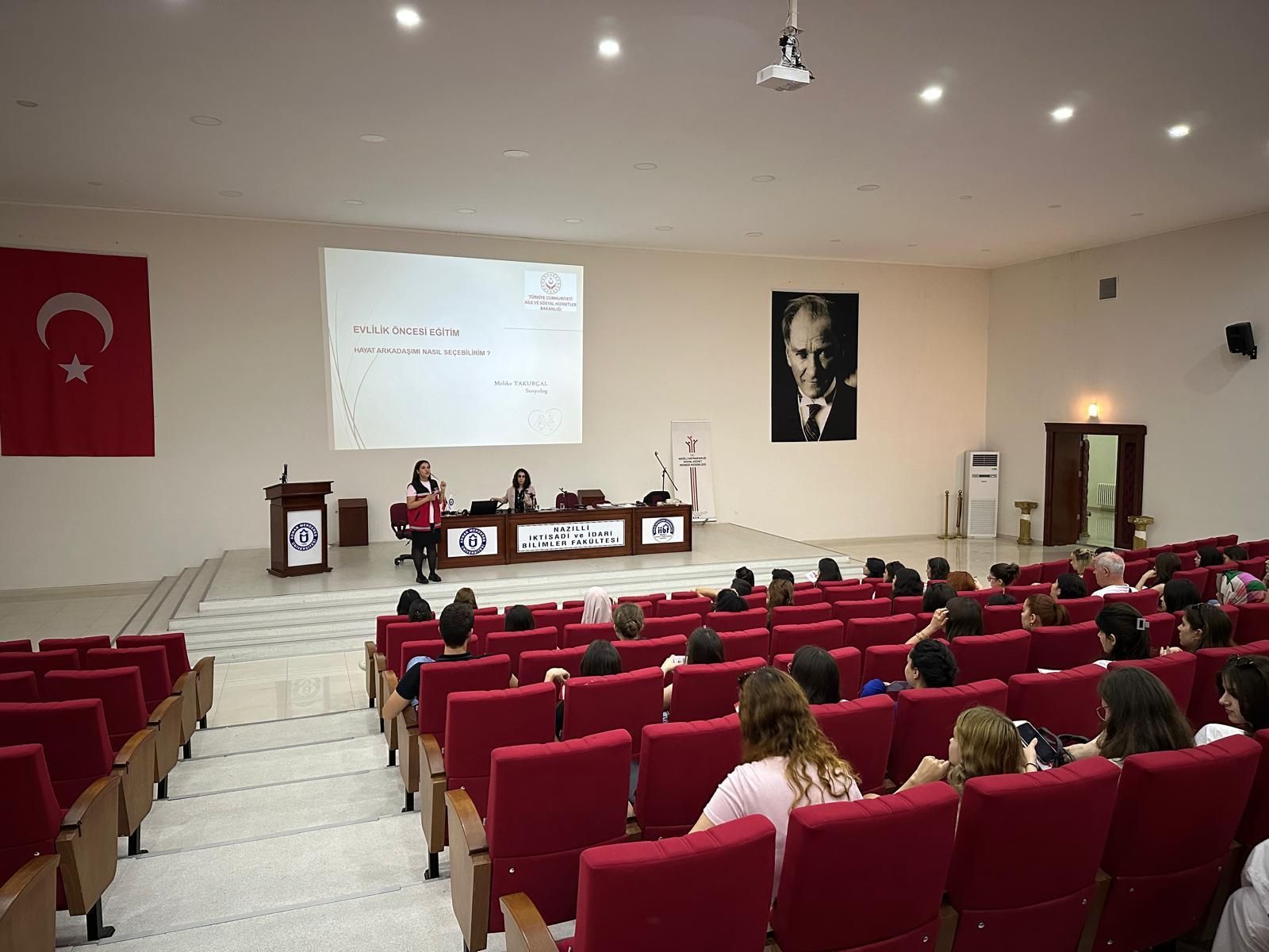 Nazilli İktisadi ve İdari Bilimler Fakültesi Uluslararası İlişkiler Bölümü tarafından düzenlenen “Doğru Eş Seçimi ve Aile İçi İletişimin Önemi” konulu seminer, 7 Mayıs 2025 Çarşamba günü T.C. Aile ve Sosyal Hizmetler Bakanlığı Nazilli Sosyal Hizmet Merkezi Müdürlüğü'nden Sosyolog Melike Takurçal'ın katılımıyla fakülte konferans salonunda gerçekleştirildi.