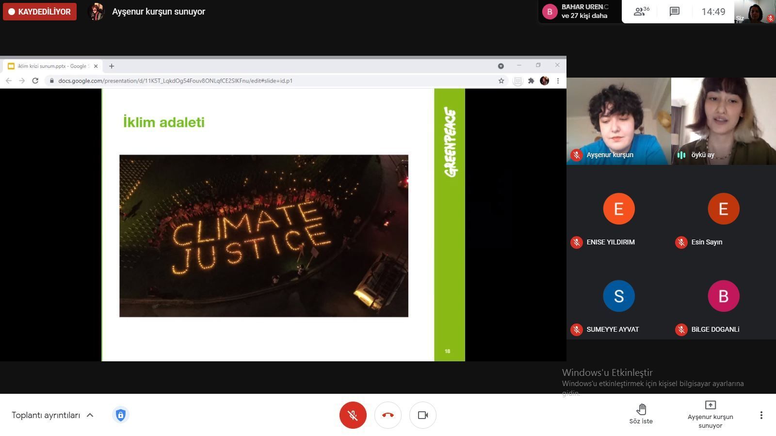 Dr. ÖÄŸr. Üyesi Dilek Elvan ÇokiÅŸler’in moderatörlüÄŸünde gerçekleÅŸen etkinlikte Greenpeace konuÅŸmacıları AyÅŸenur KurÅŸun ve Öykü Ay, İklim krizi nedir, iklim deÄŸiÅŸikliÄŸinin engellenmesi için yapılan faaliyetler nelerdir konusunda bilgi verdi.